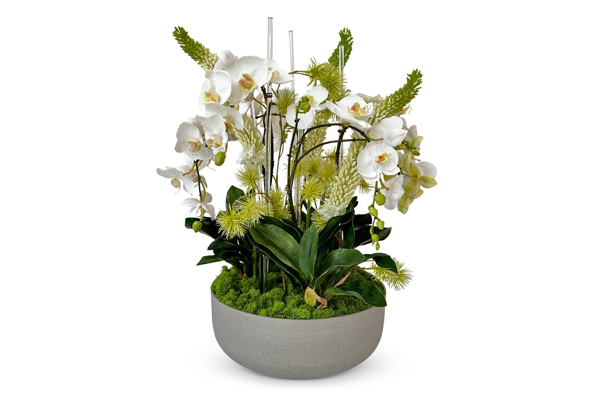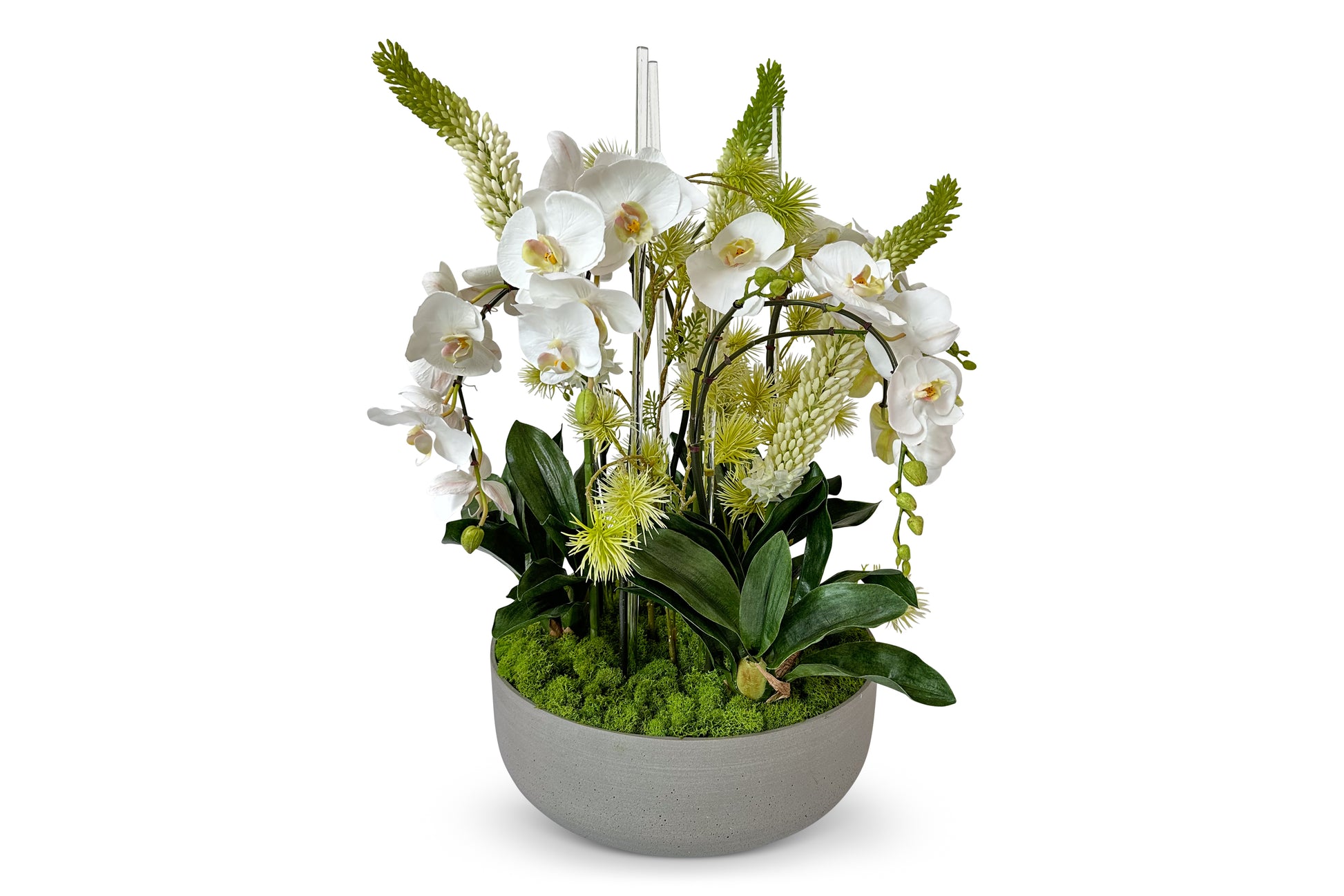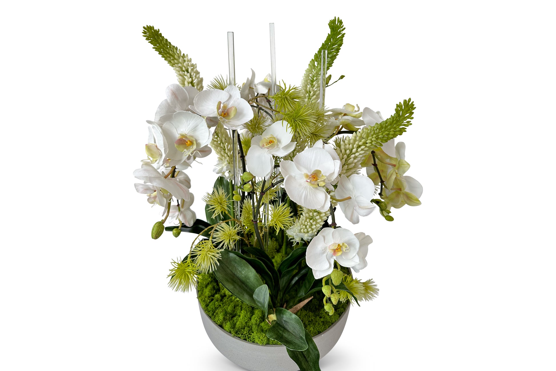 This design features faux white orchid sprays, white faux foxtail blooms, glass rods, and faux cymbidiums leaves nestled into preserved reindeer moss