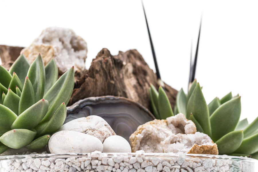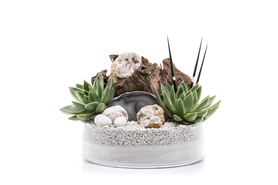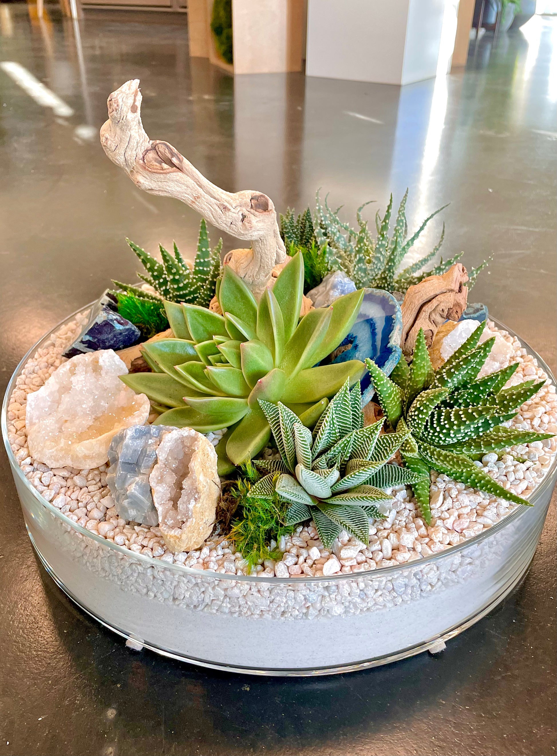 Are you looking for a jaw dropper? The Ross is a luxurious piece for any space but especially as a focal point. Clean sand and gravel seen through the glass set a plate for succulents, geodes, agate slices, porcupine quills and a reclaimed wood stump.