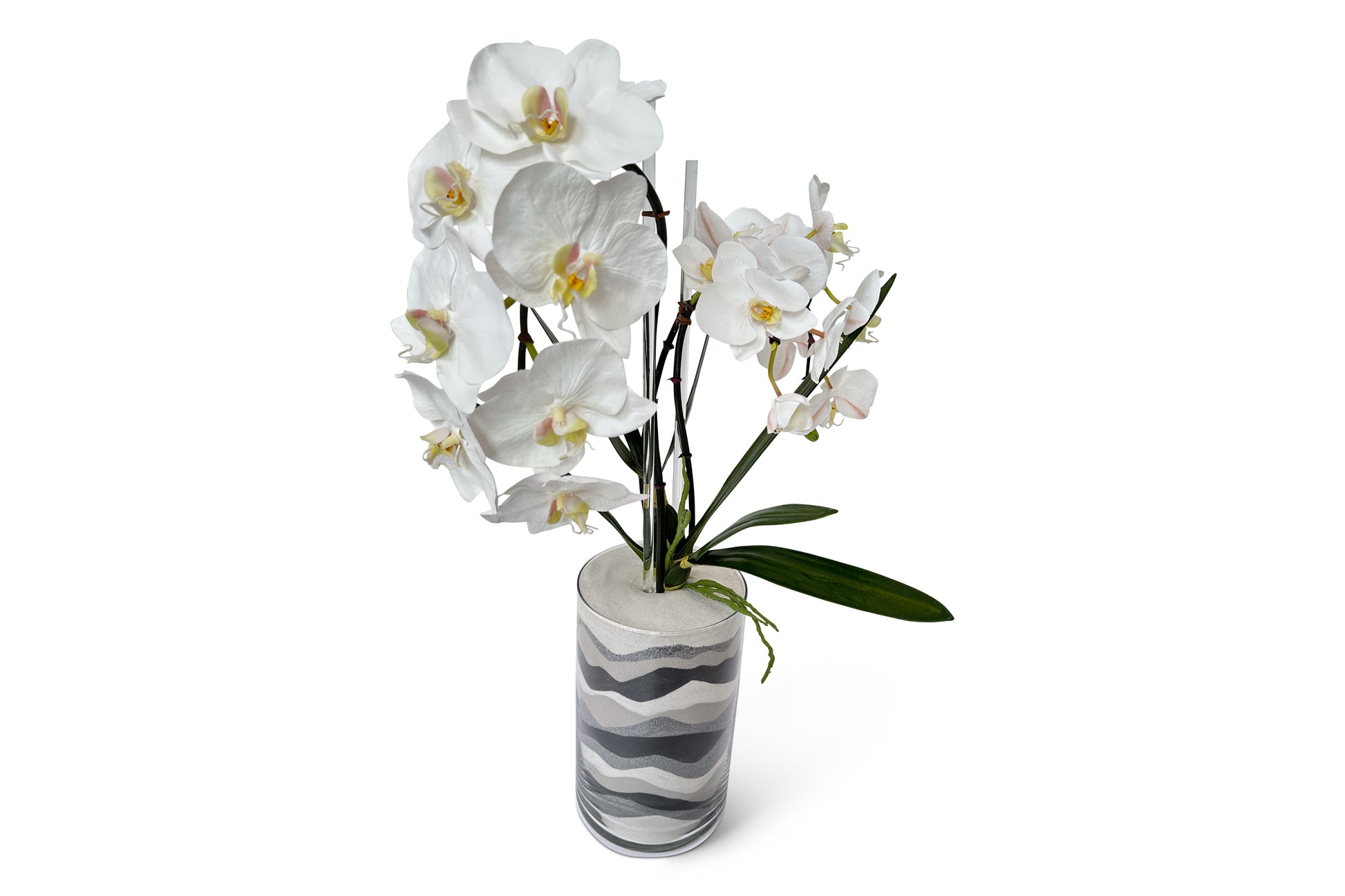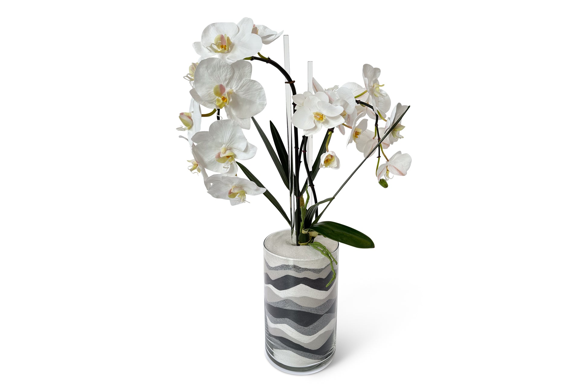 Faux white orchid sprays in glass cylinder with grey, black, and silver sand waves in white sand.