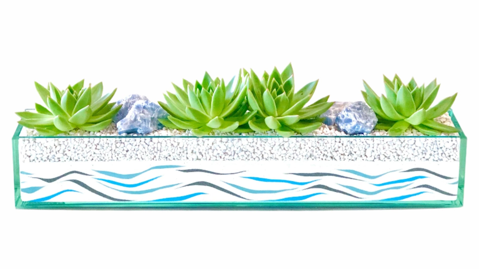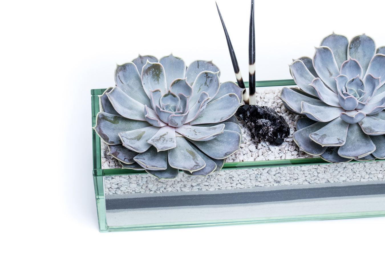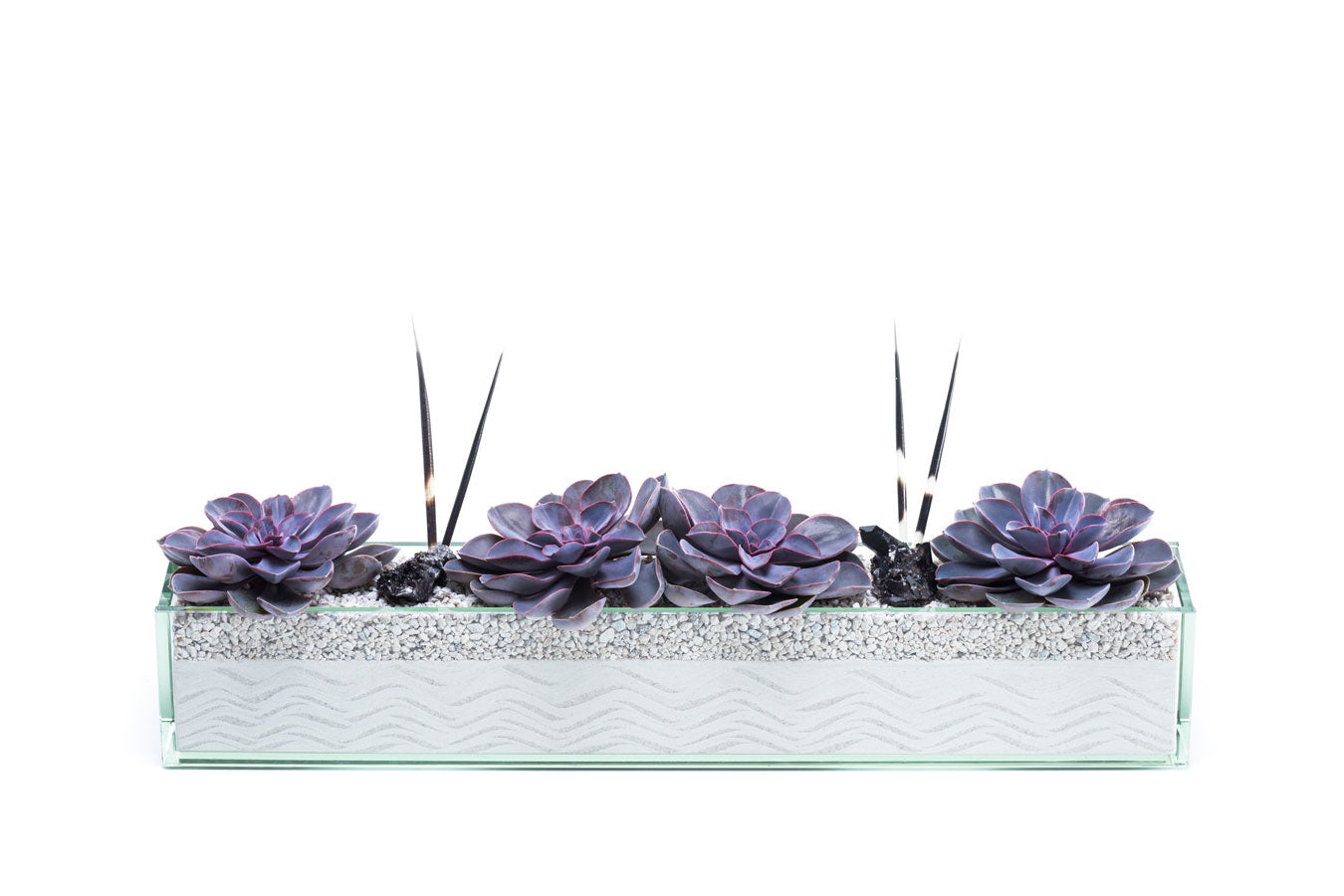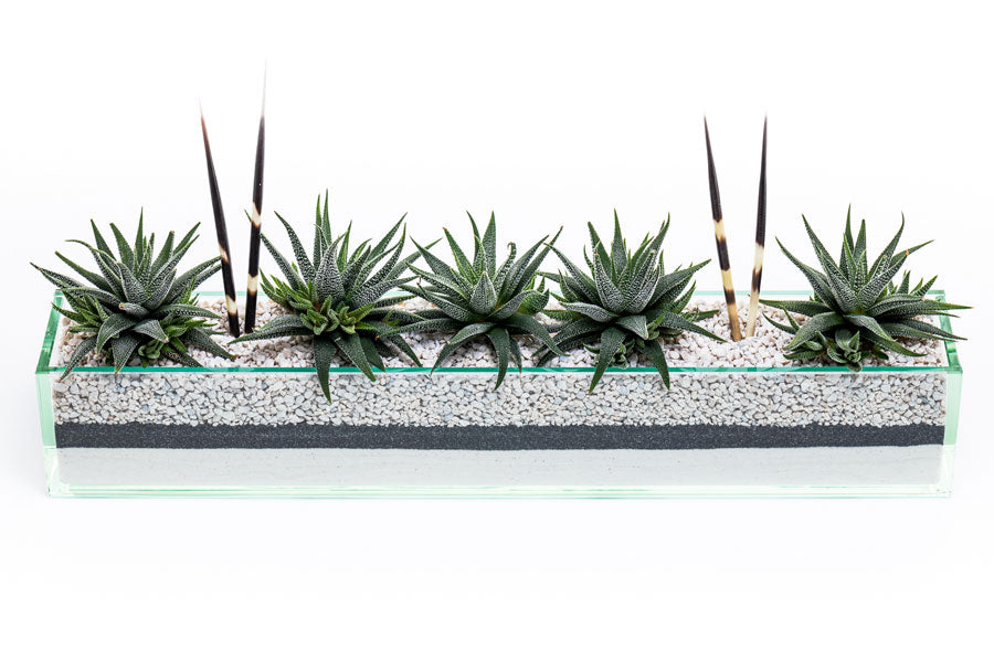 Commerce Main is a thin linear centerpiece perfect for a dining or conference table needing a little extra character. An array of sand designs are available to in order to compliment any space. Commerce Main arrangements are created using natural accents such as preserved moss, geodes, agate slices and/or porcupine quills causing all of our designs to be unique to every customer.