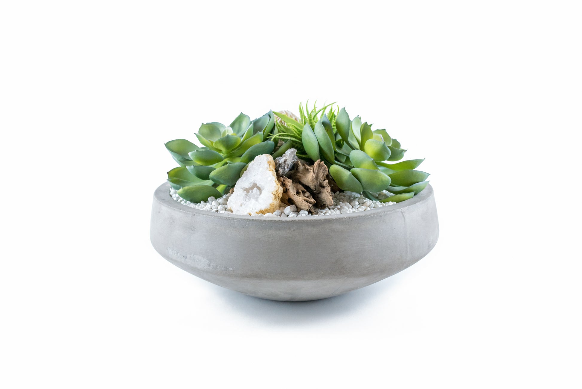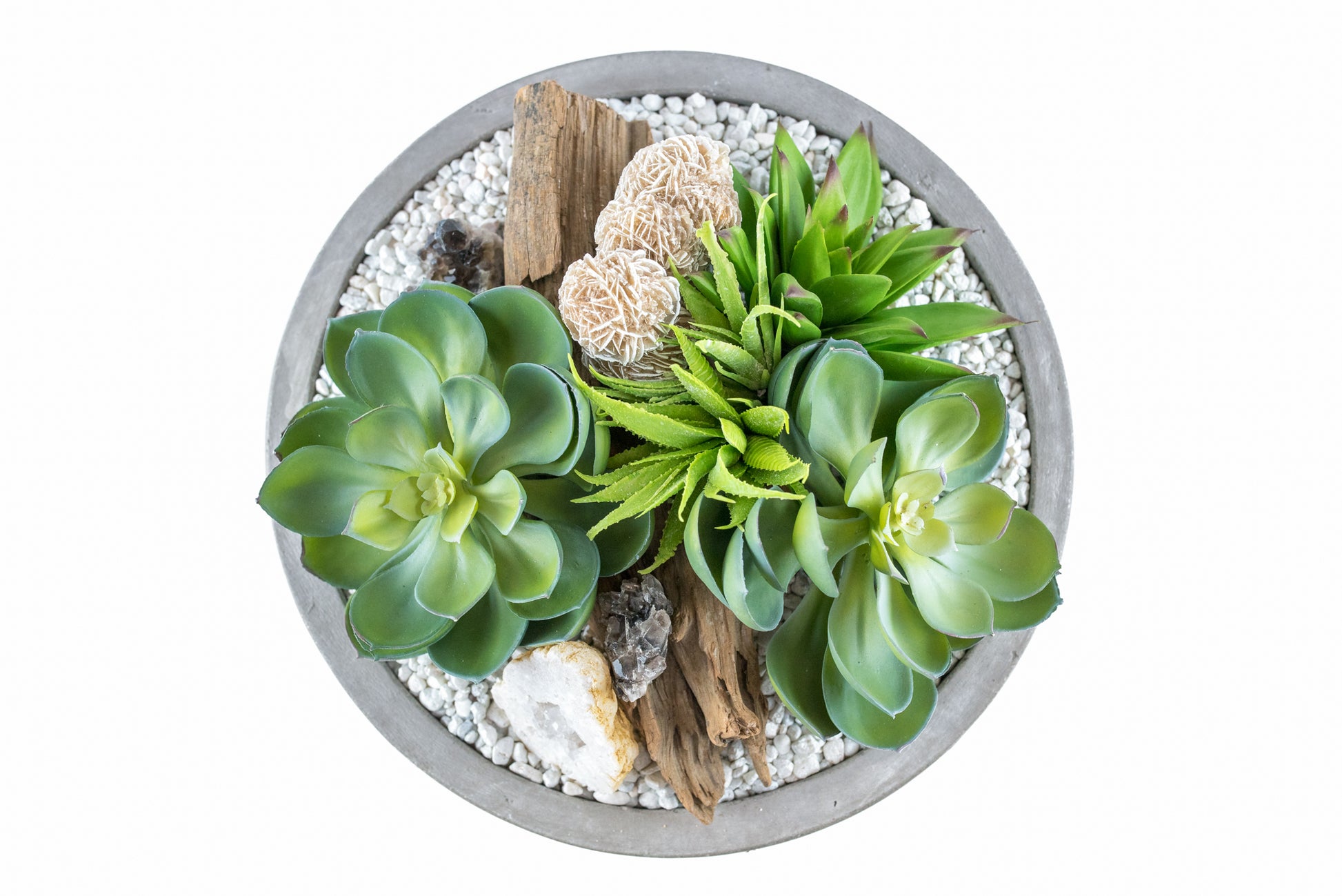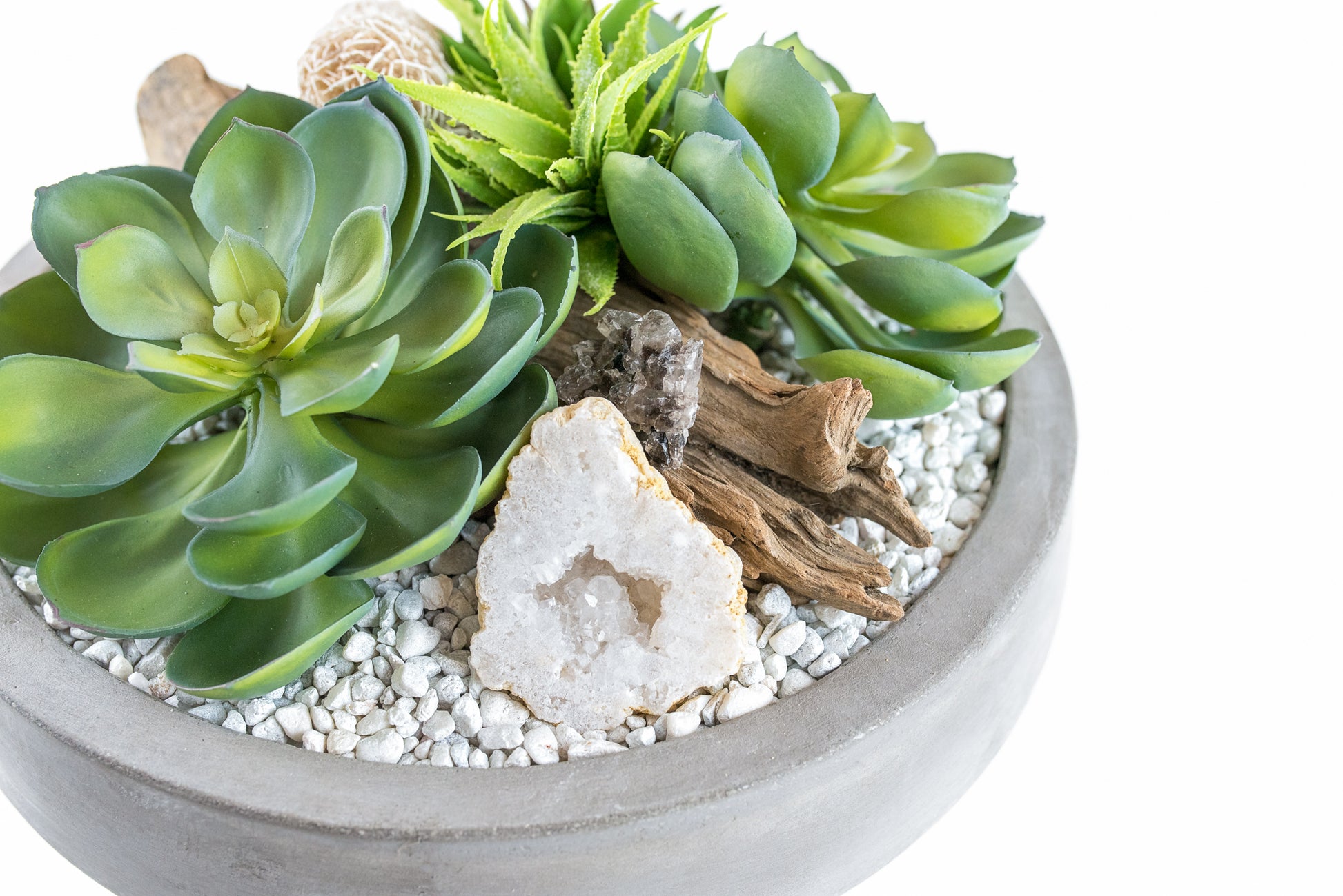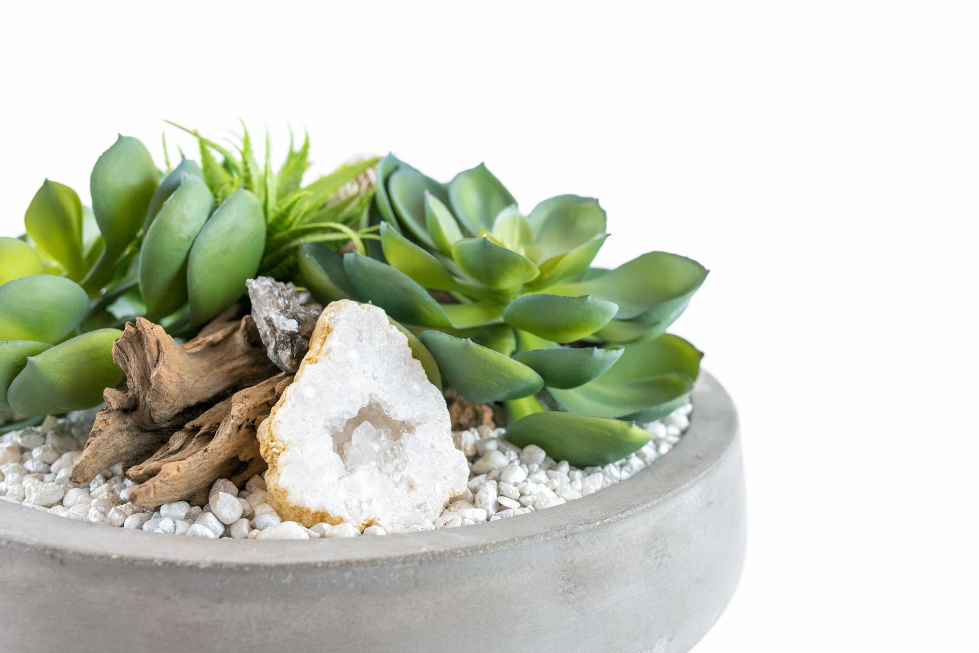 Natural green toned faux succulents placed with reclaimed driftwood, geodes, smokey quartz and desert rose selenite. A perfect arrangement for any space in need of warmth.