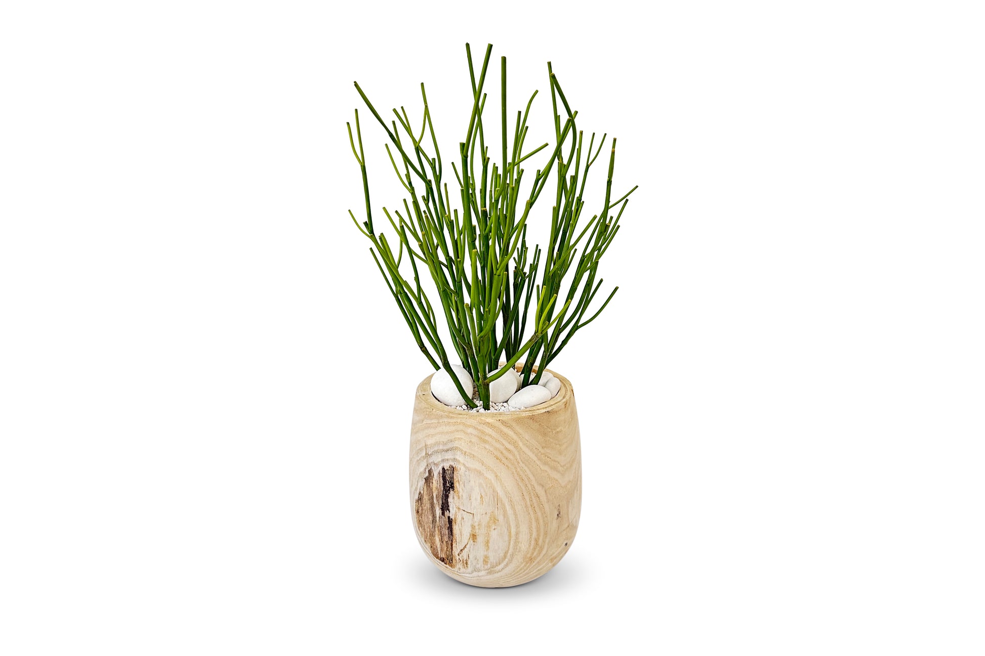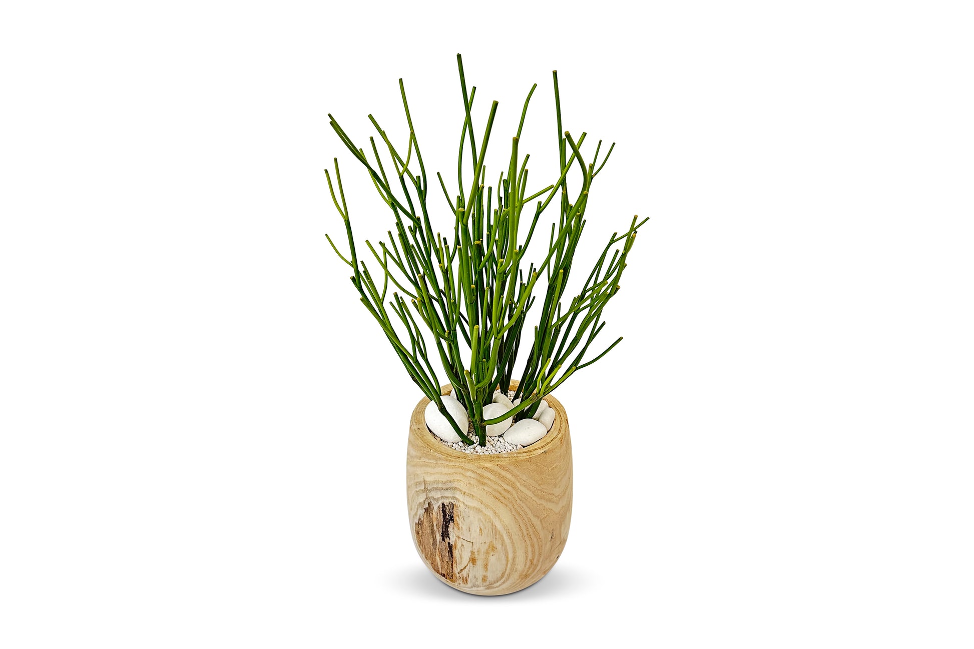 Faux Pencil Cactus in wood pot with white rock and egg pebble