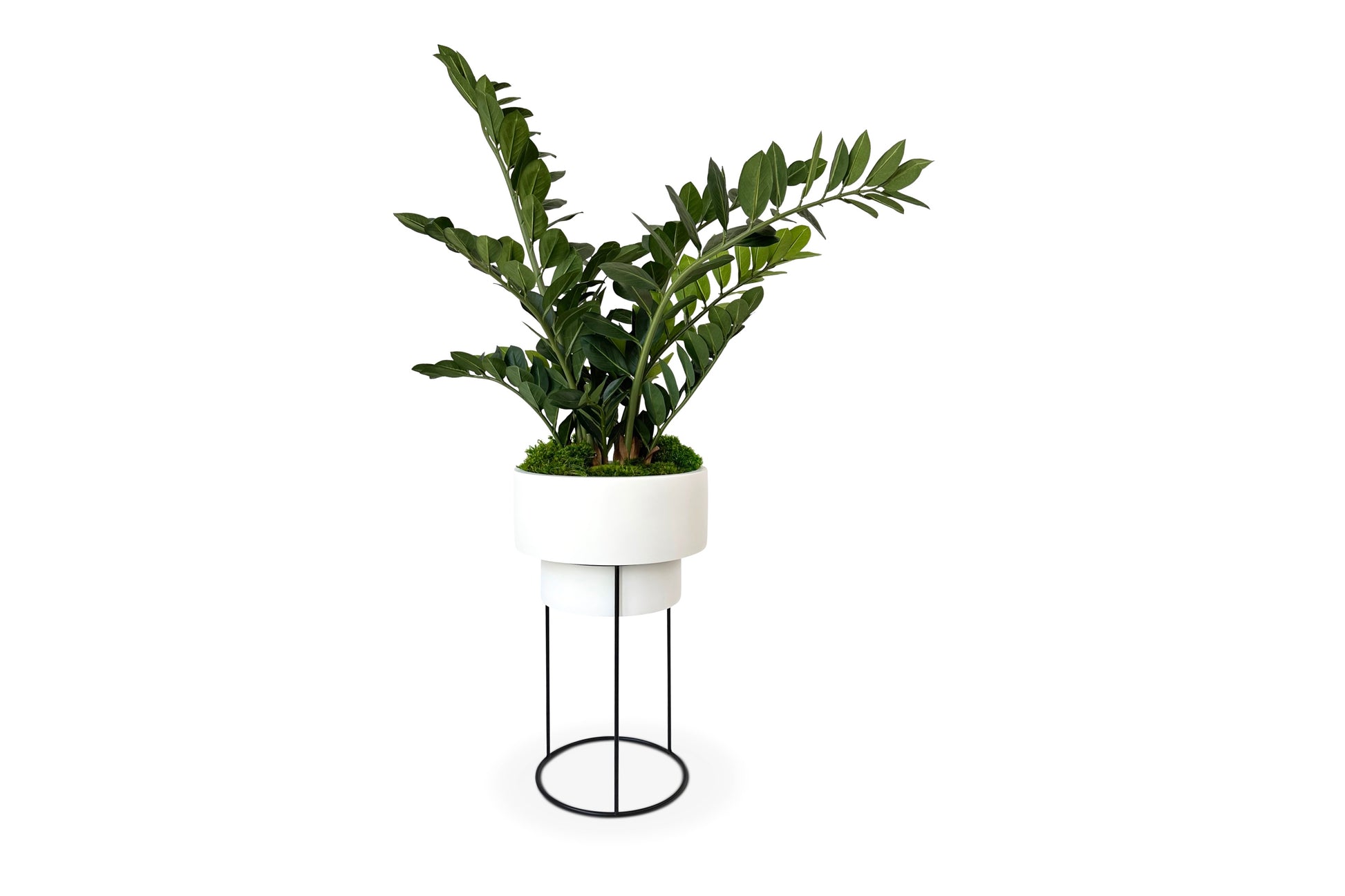 Faux Zamioculcas Zamiifolia in white planter on black metal stand with preserved mood moss