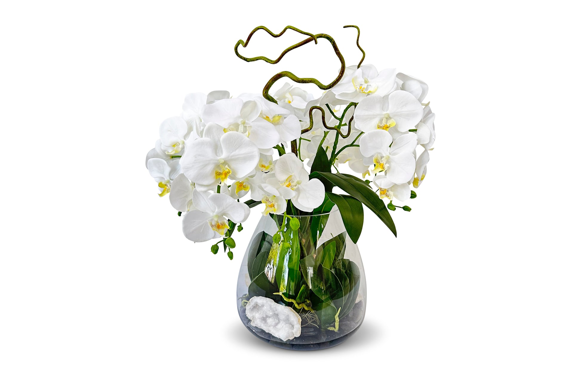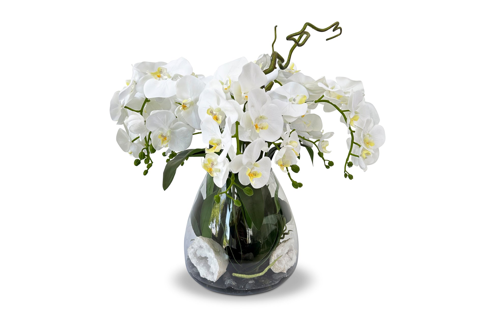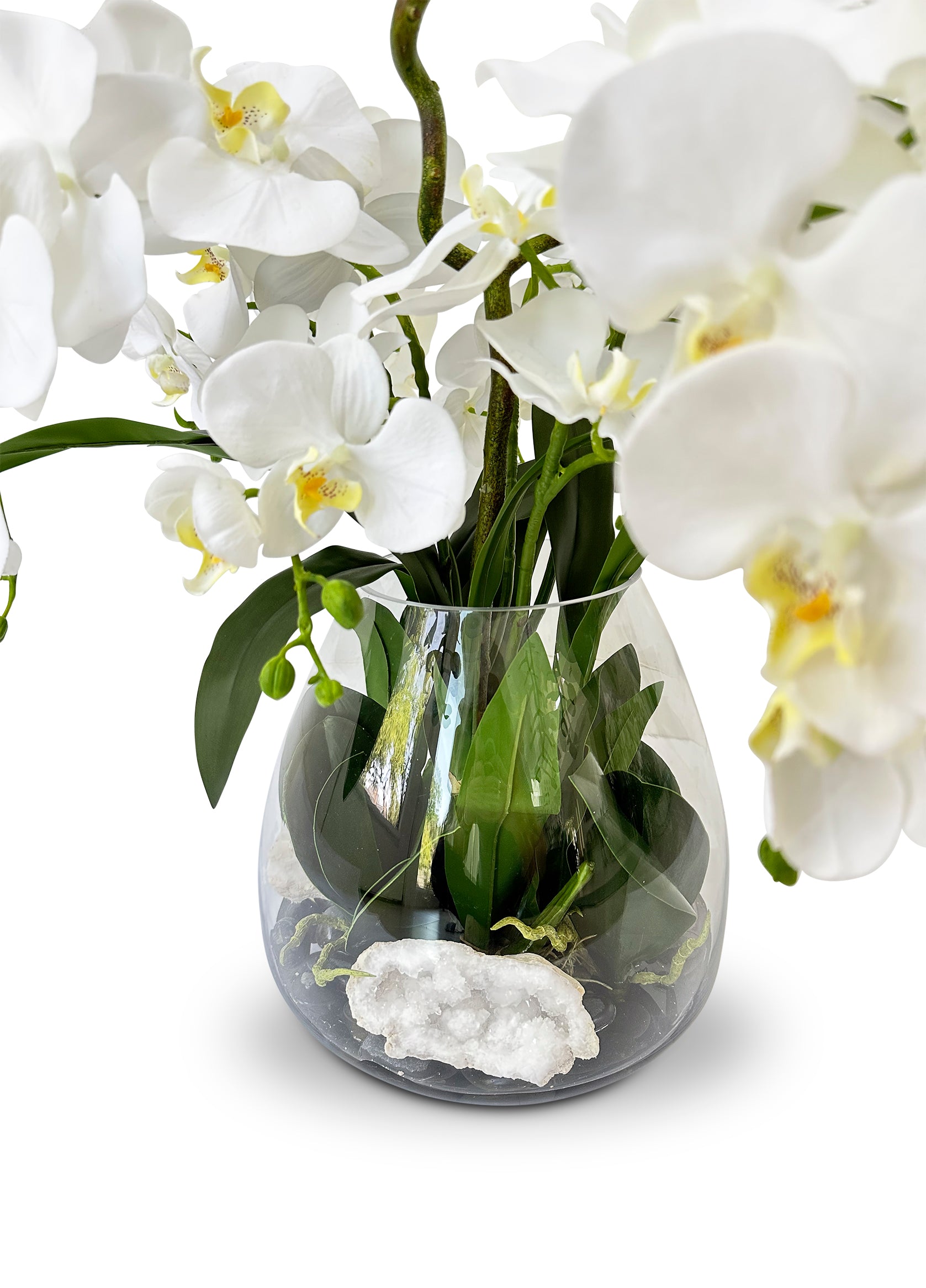 Glass vase with black rock and resin water, filled with white faux orchids sprays, leaves and accented with large moroccan geodes