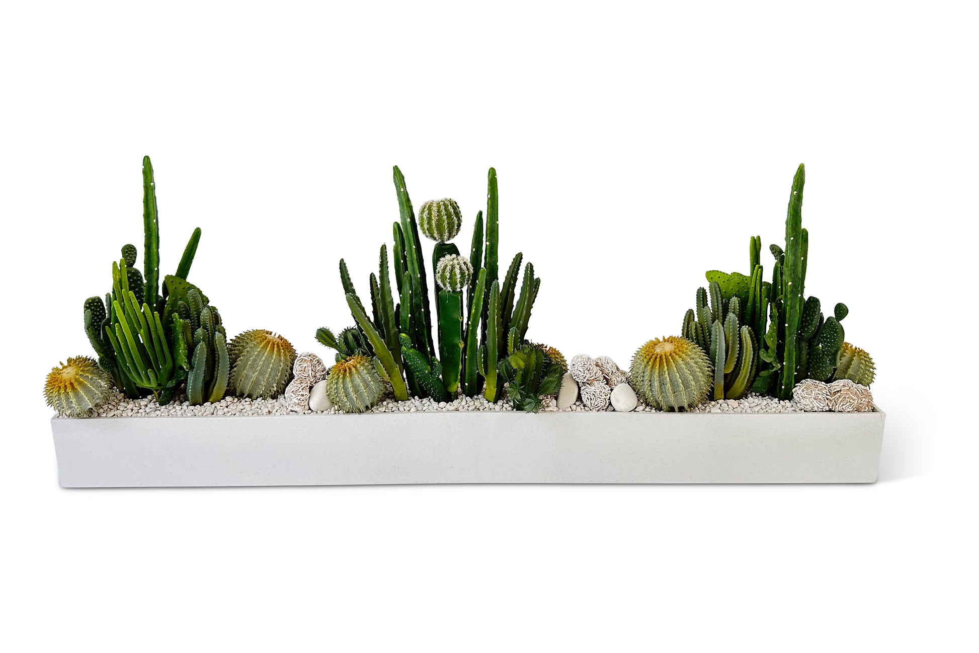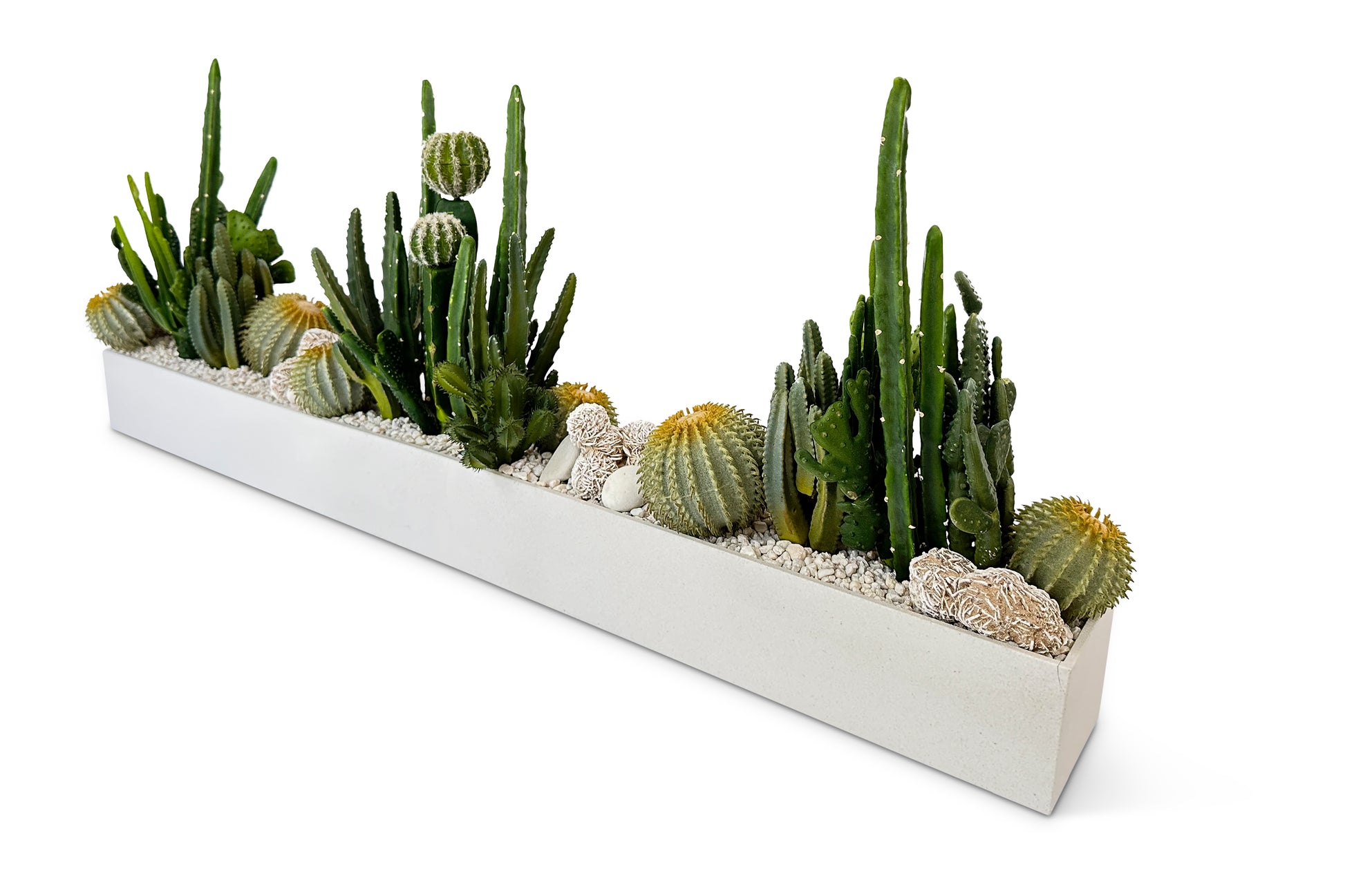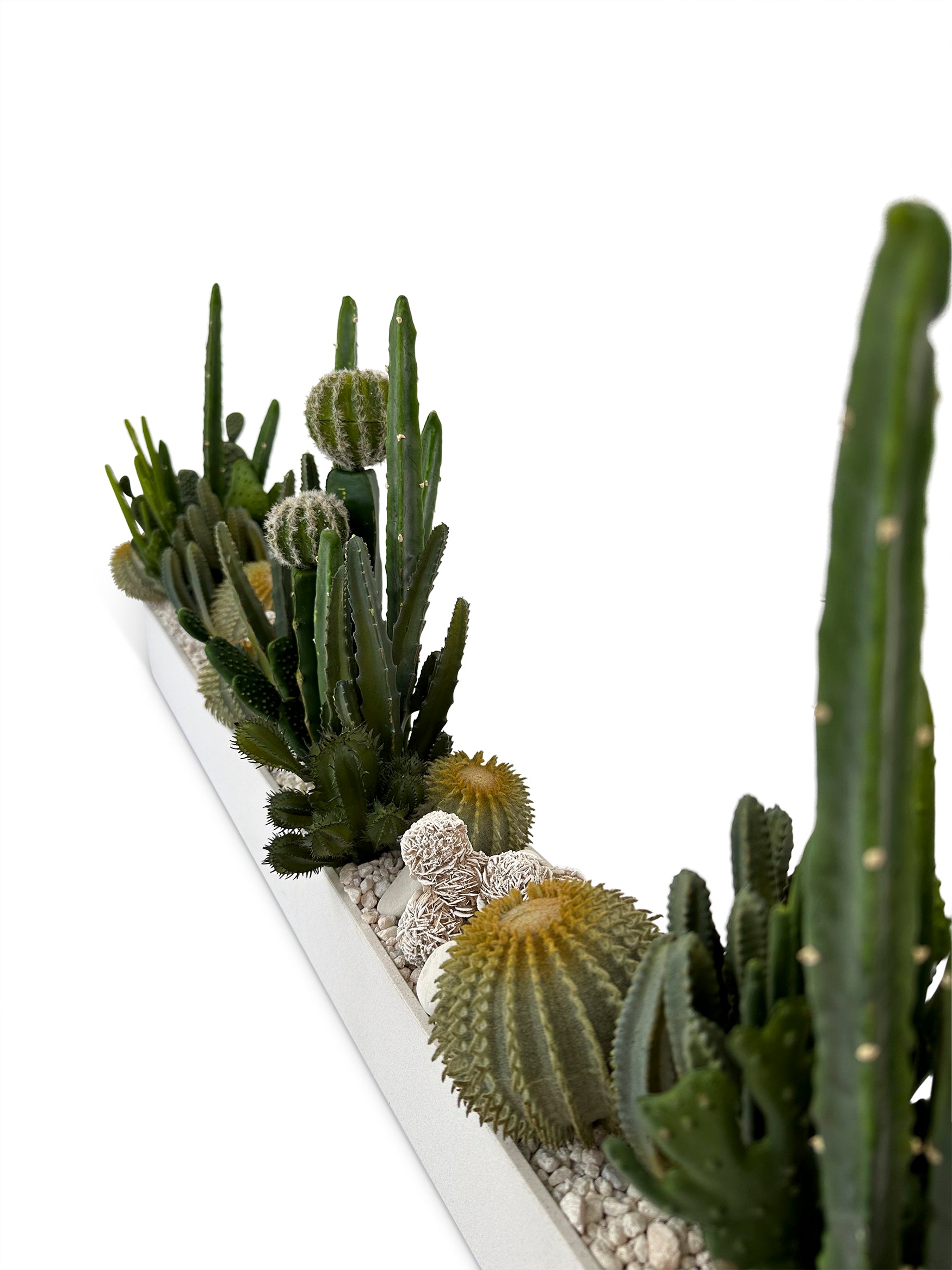 White resin vase with white rock, a mix of faux cacti, desert rose selenite, and white egg pebble.