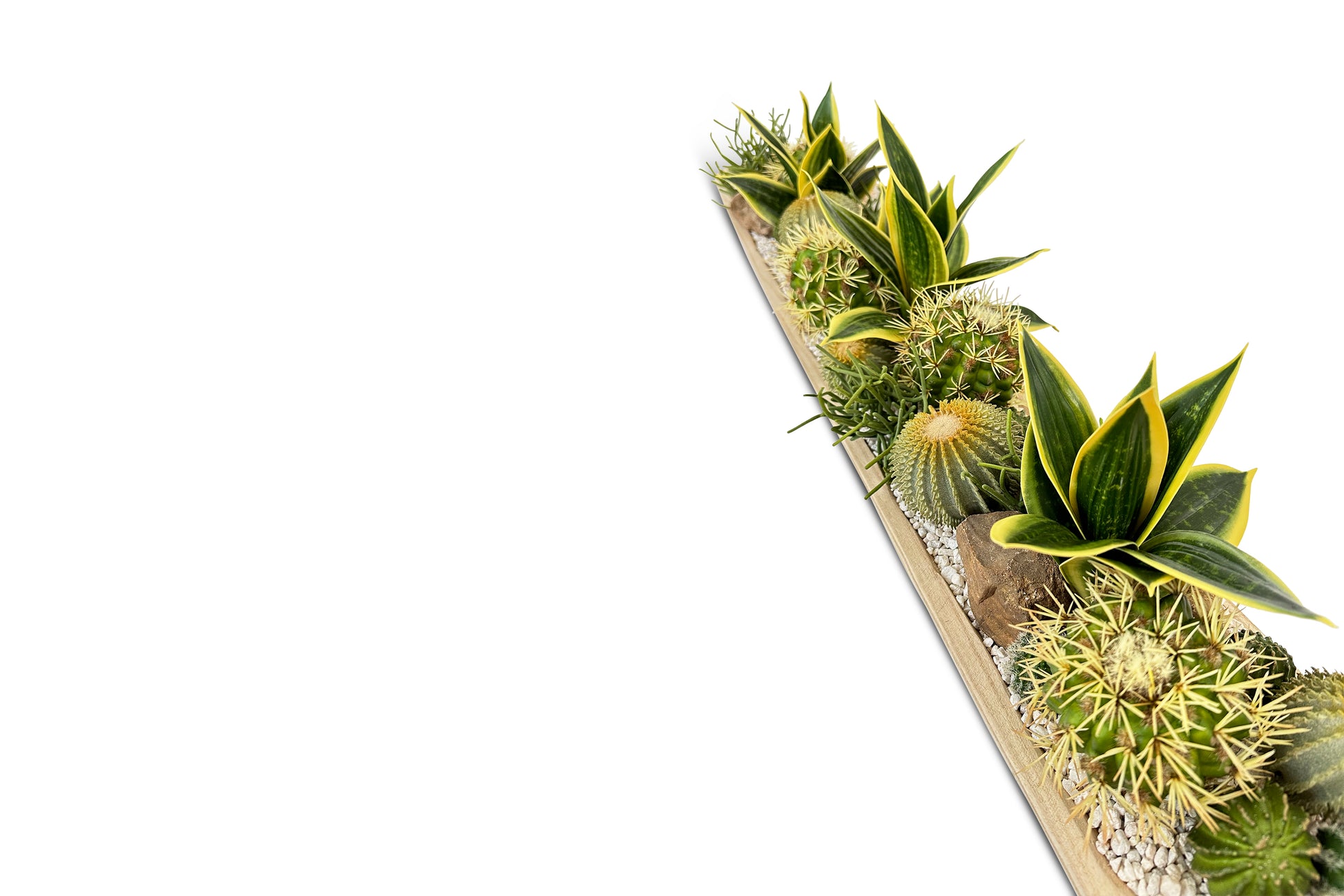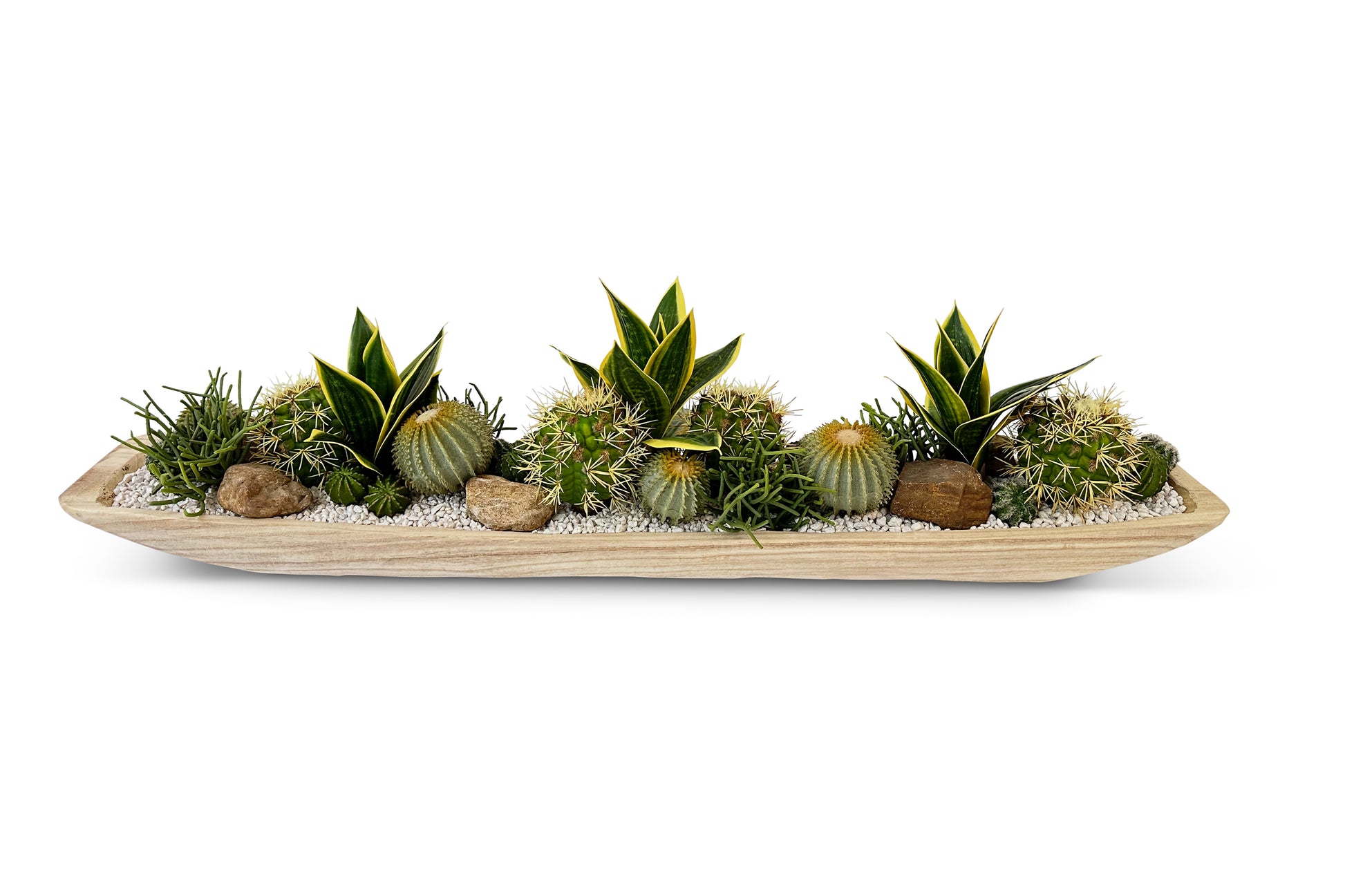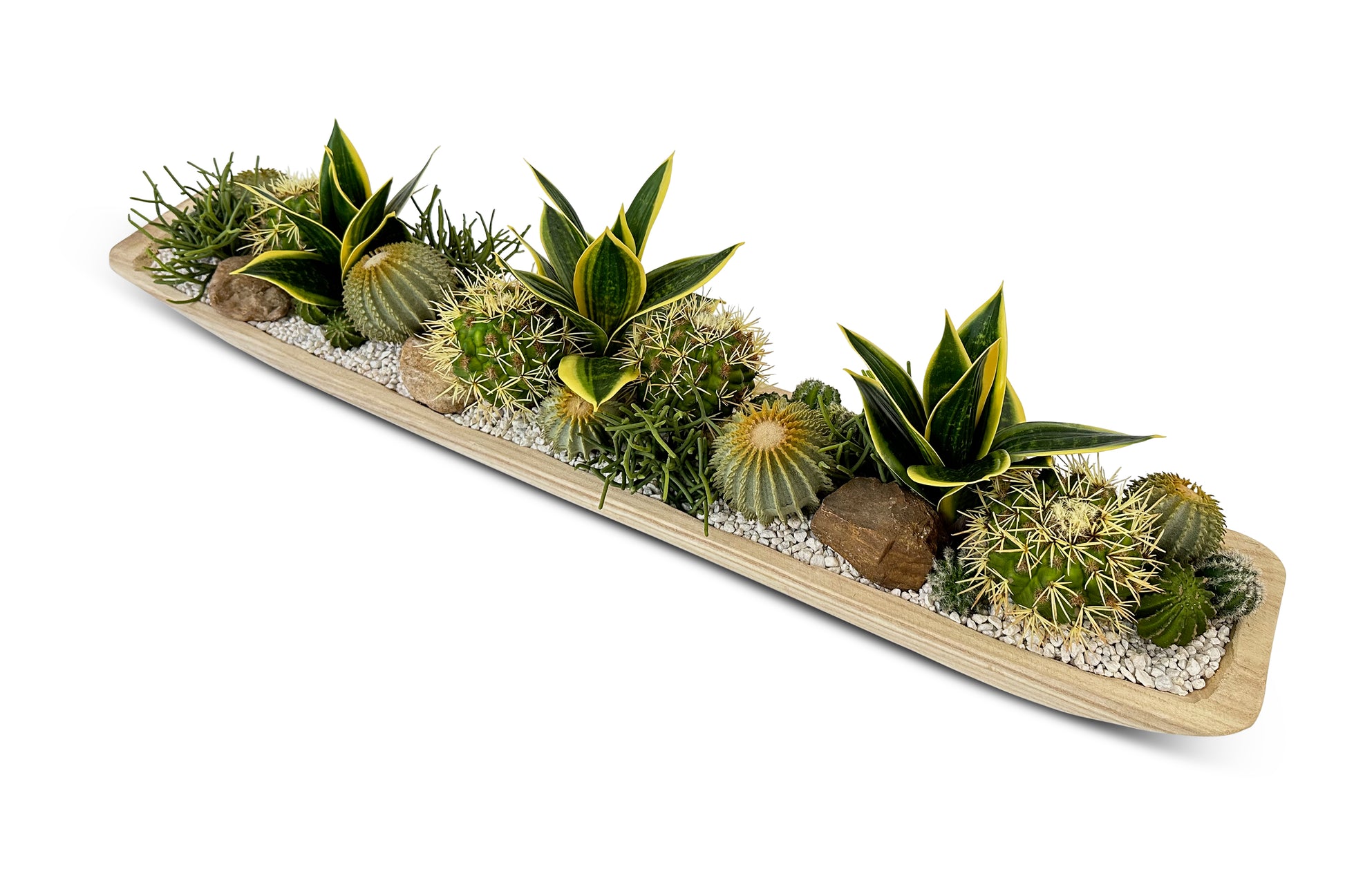 Natural Wood Tray with white rock, a mix of faux cacti, and petrified wood.