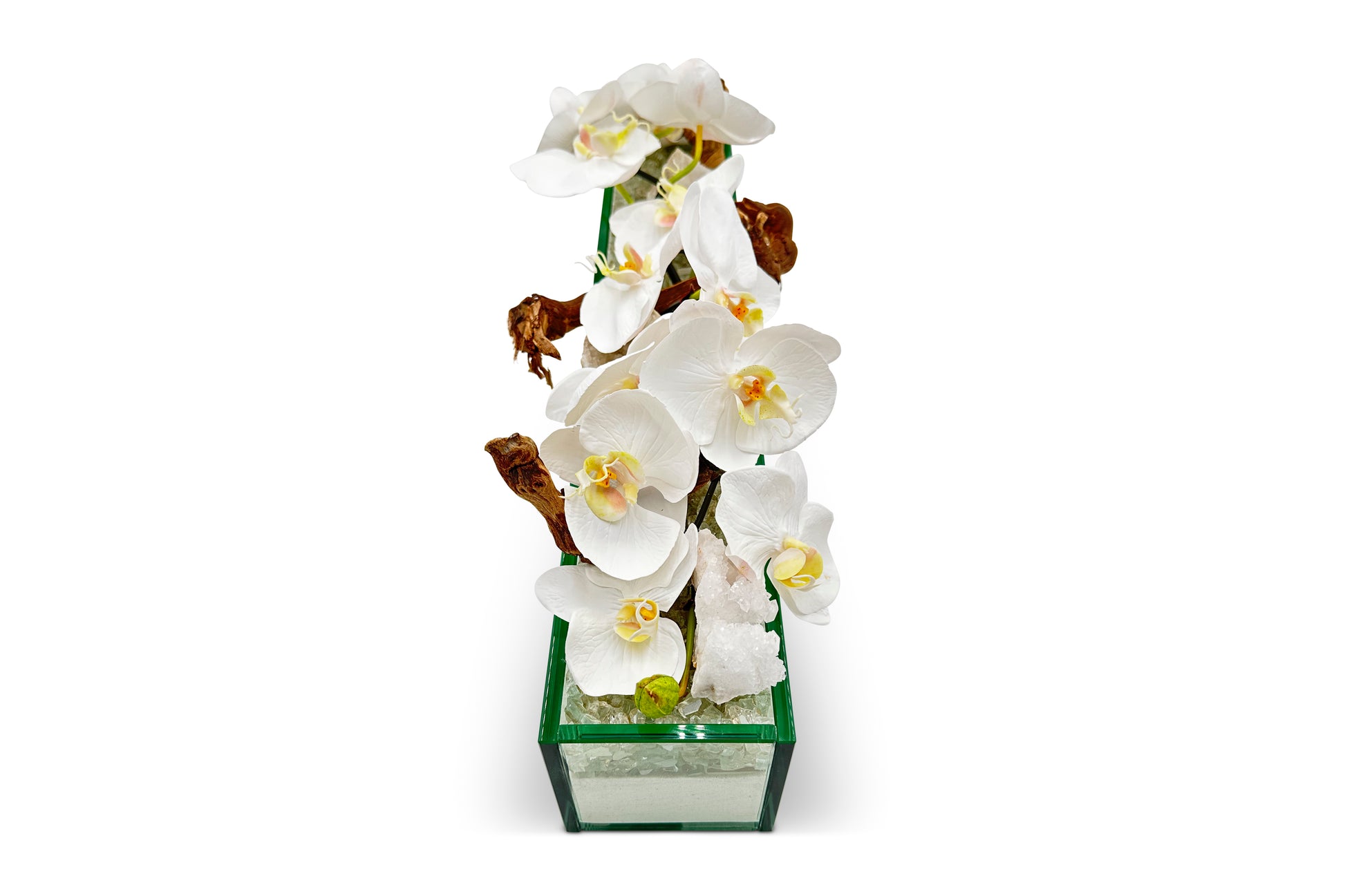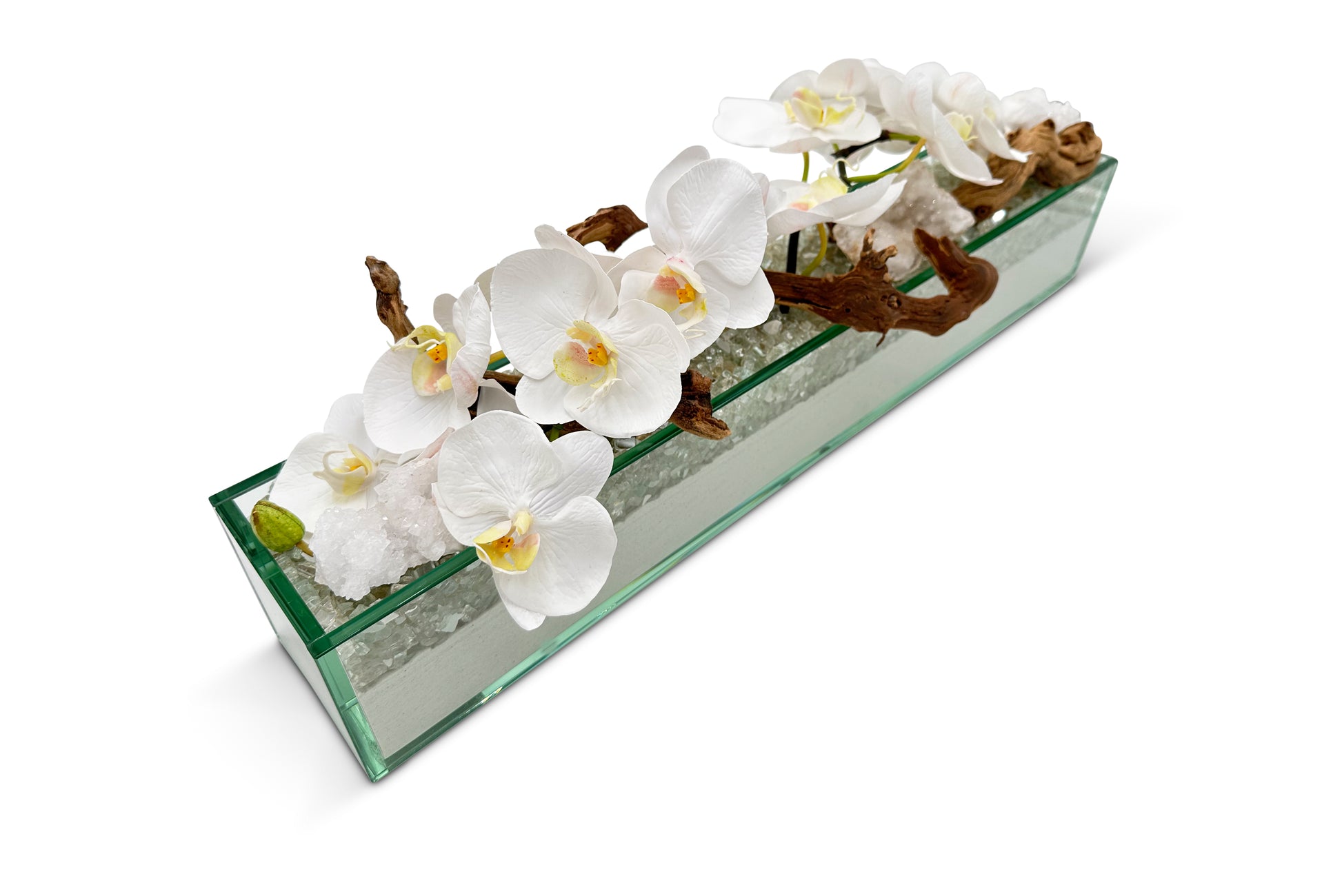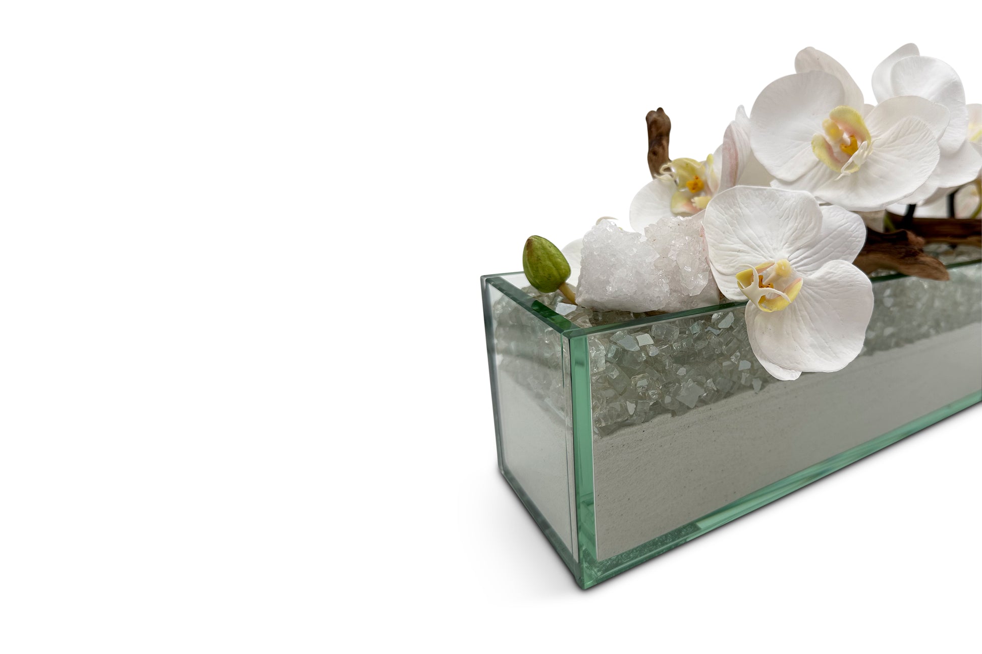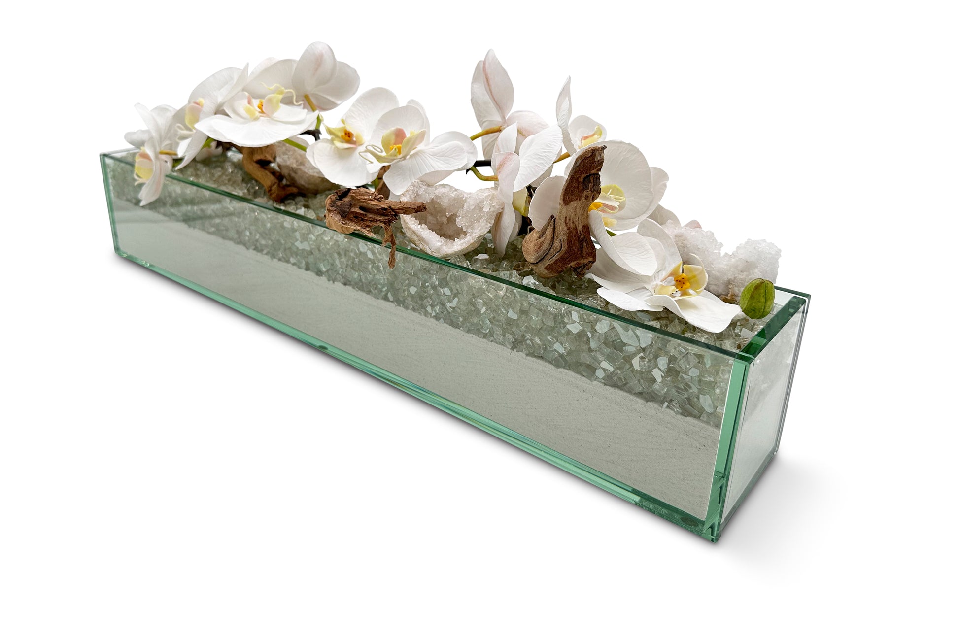 Plate Glass Planter filled with white sand and silver cut glass, accented with natural grape wood, moroccan geodes and draped faux white orchid buds