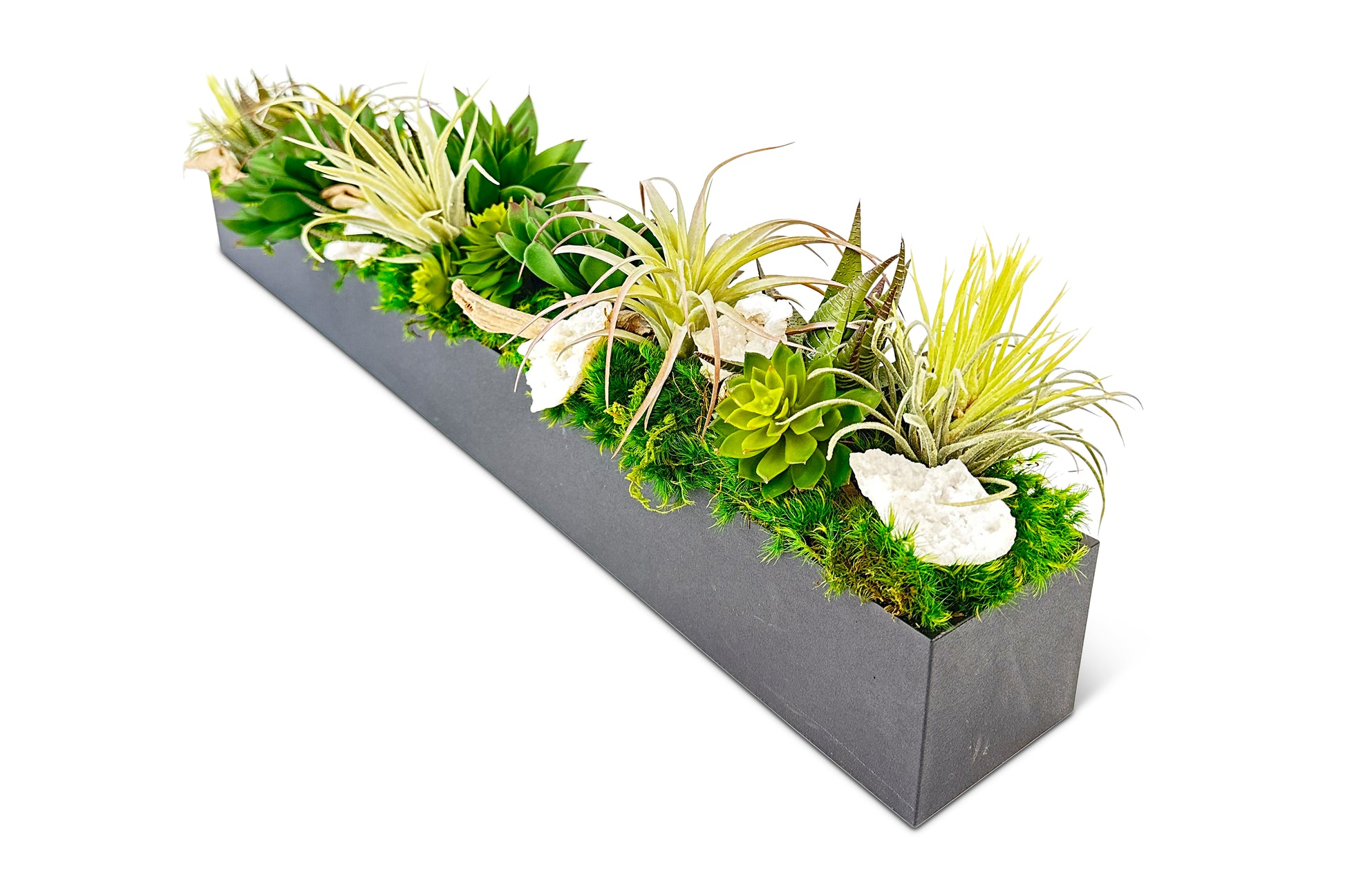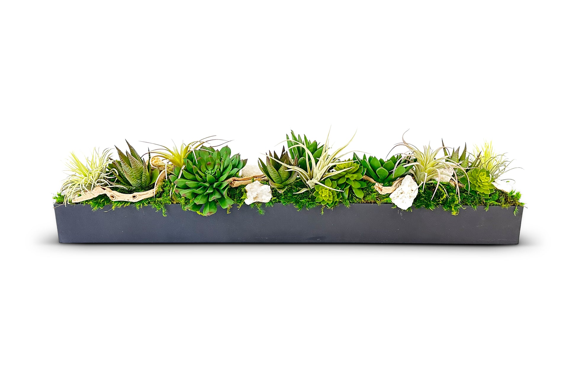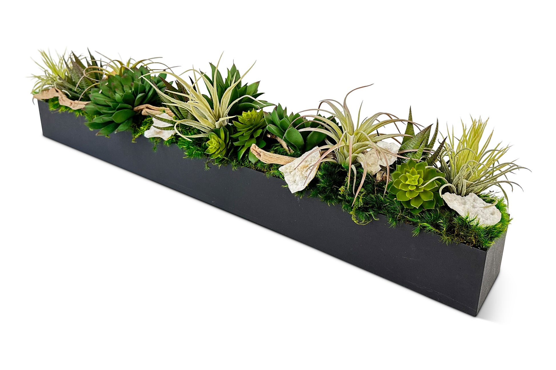 Black resin planter with preserved mood moss, faux succulents, faux air plants, grape wood, and moroccan geodes.