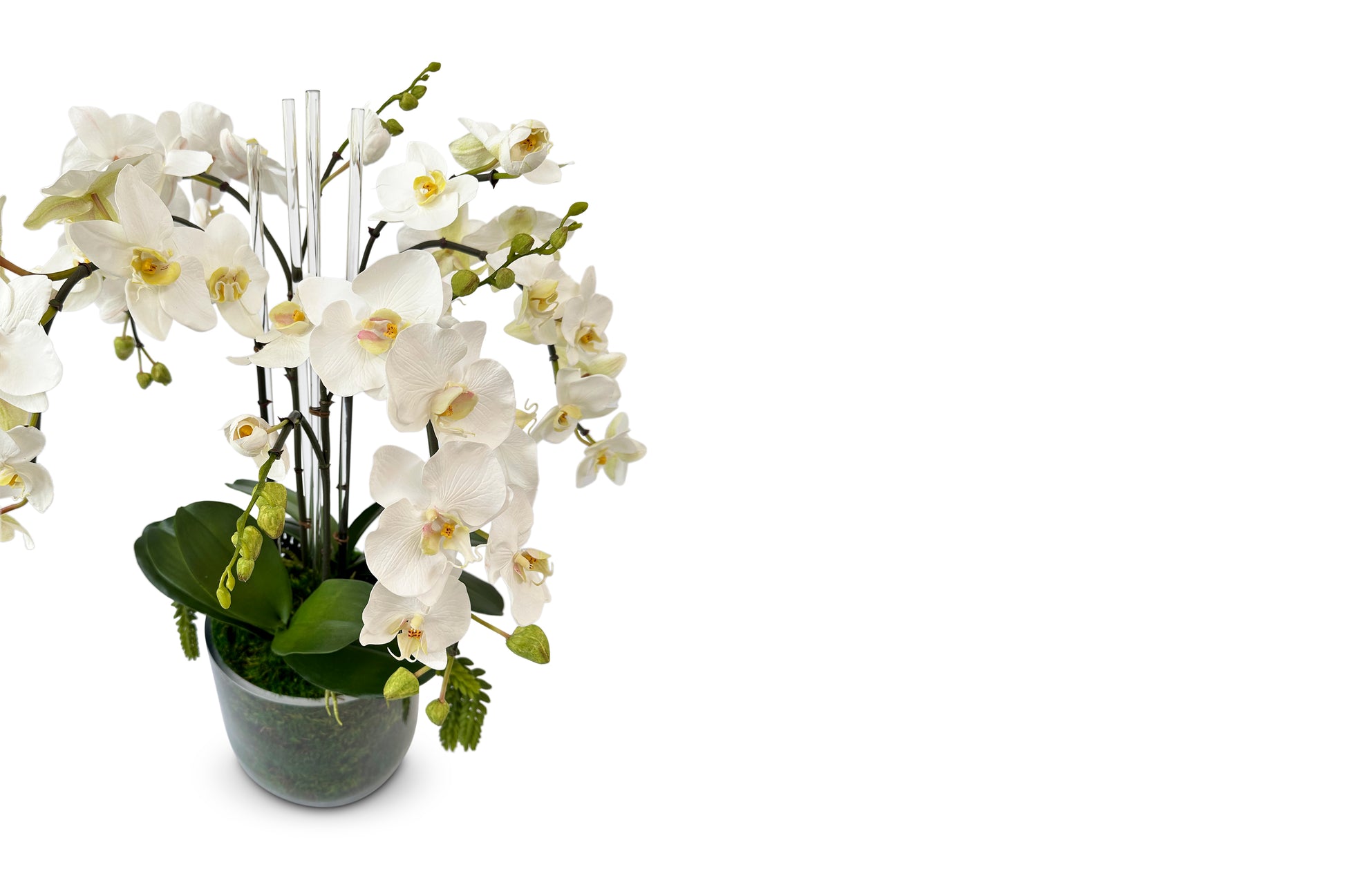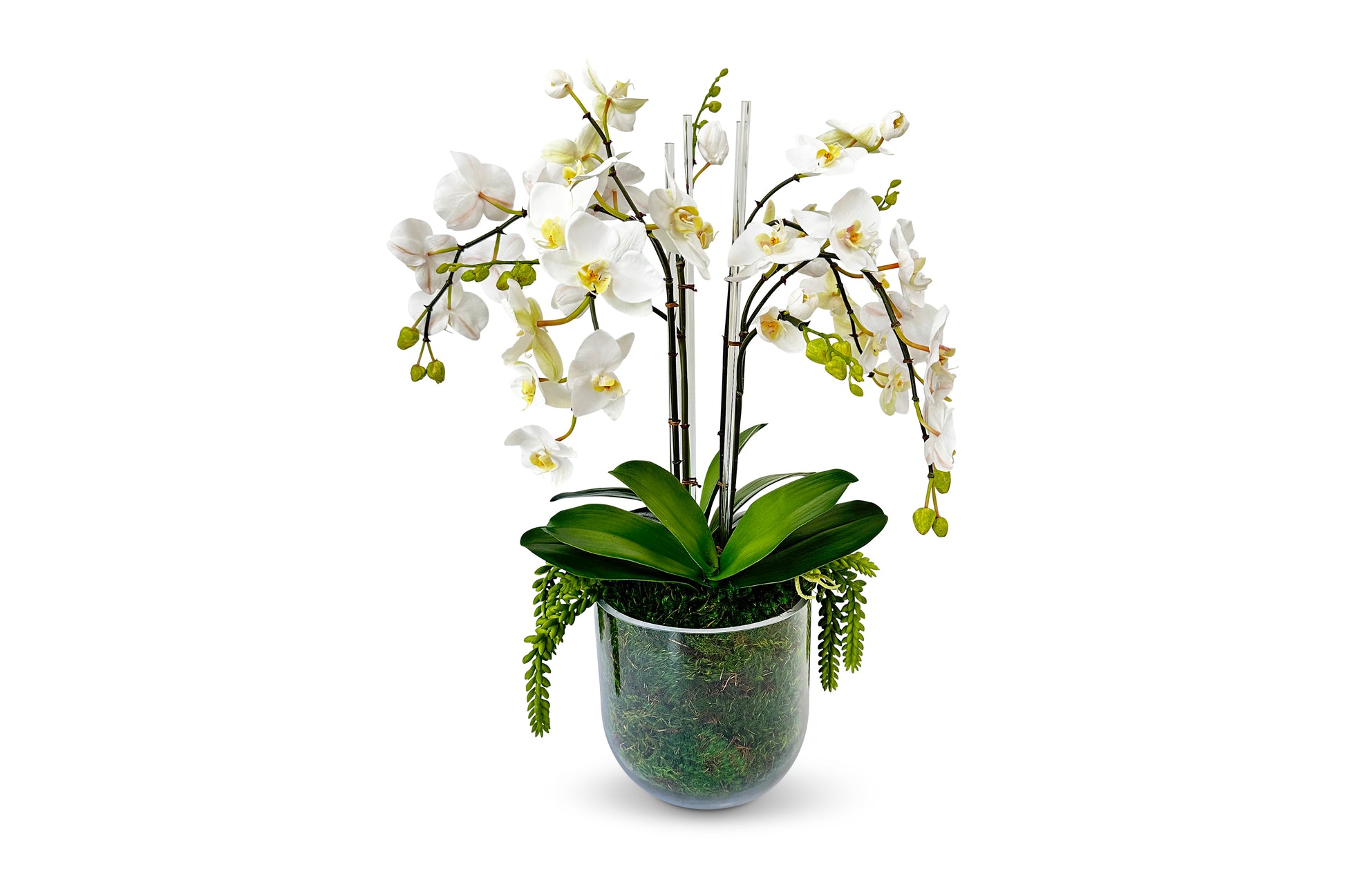 Glass bowl filled with preserved mood moss, faux white orchid sprays, glass rods, and faux draping donkey tail.