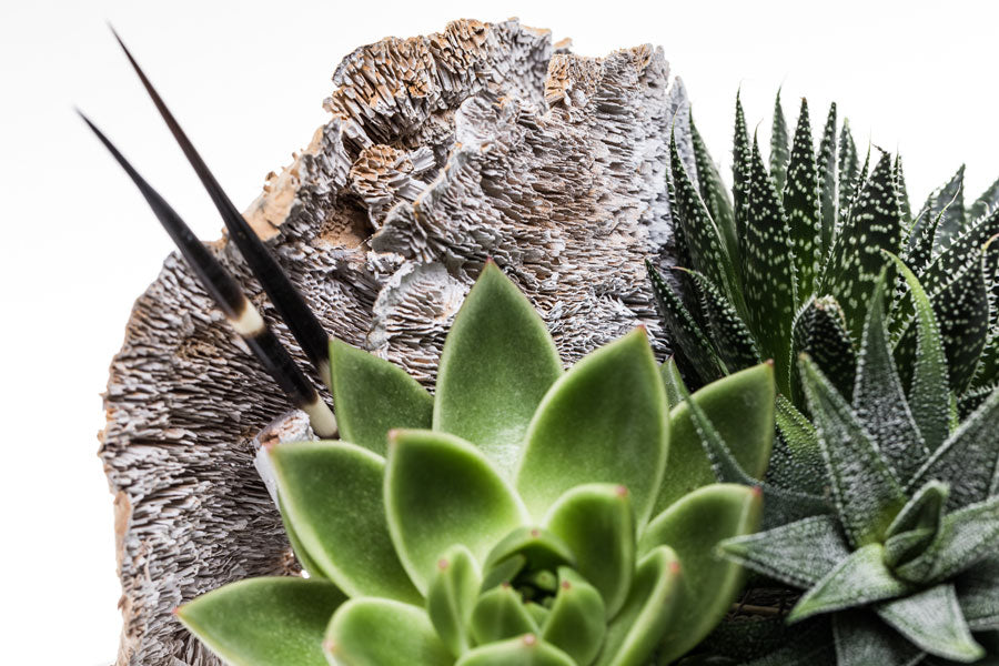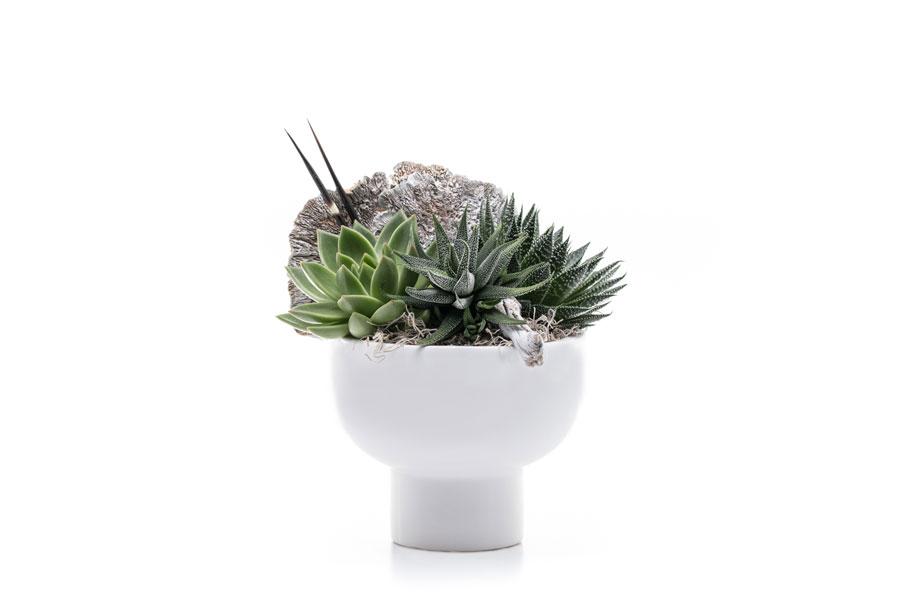 Modern compote style vessel with dried mushrooms, porcupine quills and succulents. Comes in two sizes.