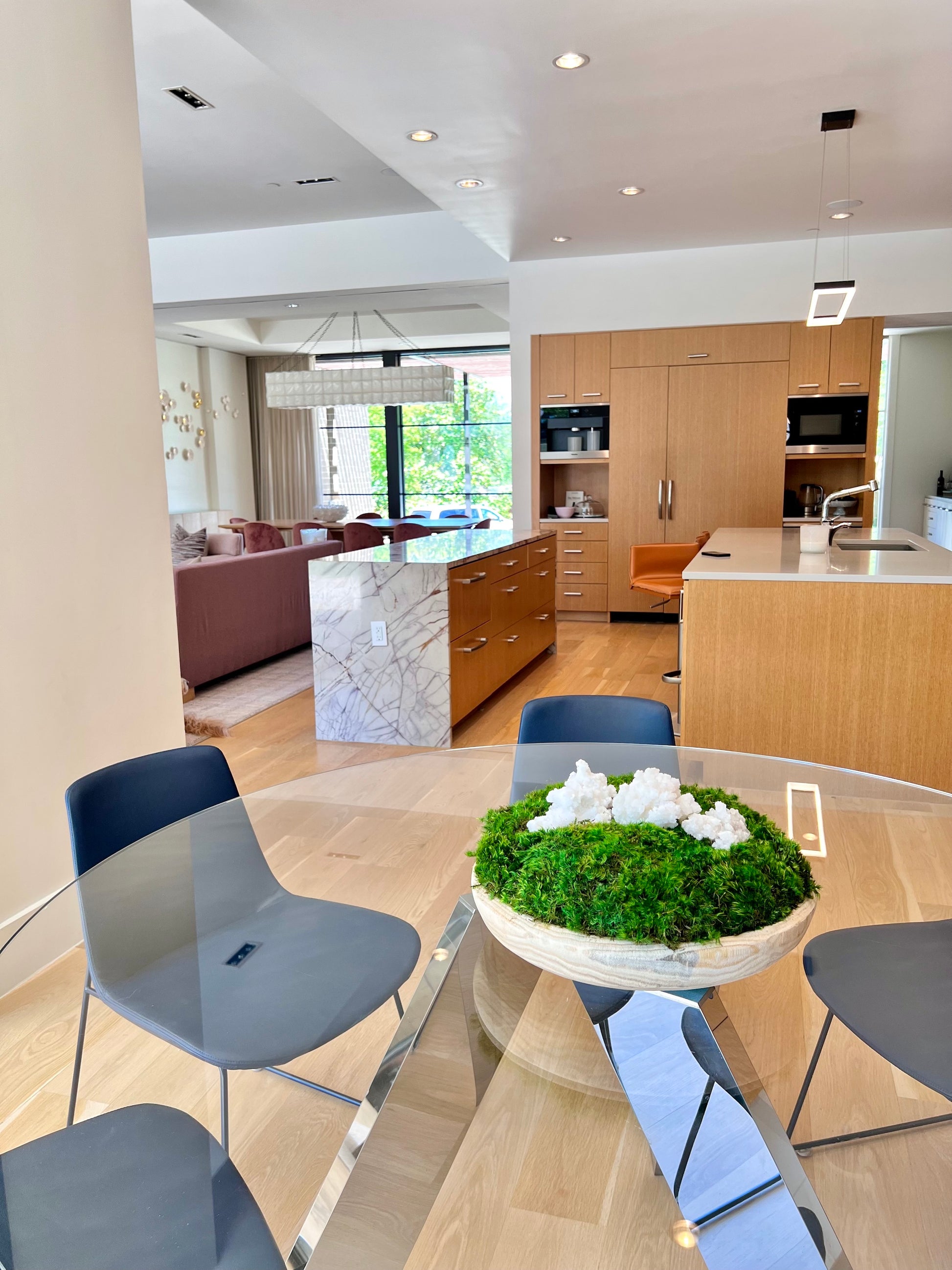 This beautiful carved wood bowl is filled with preserved mood moss and topped with white Aragonite crystals. Aragonite is thought to help us in times of distress to clear away stress from our modern lives, ensuring we remain in a state of ease and stability.