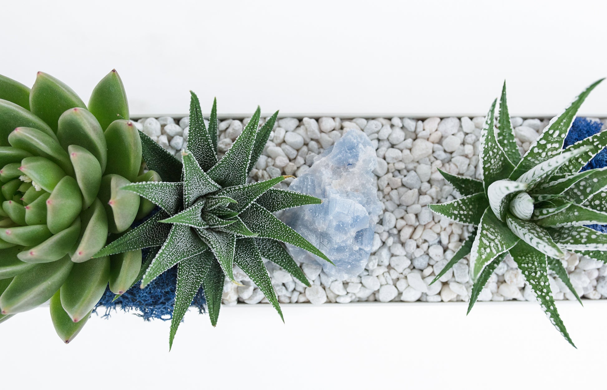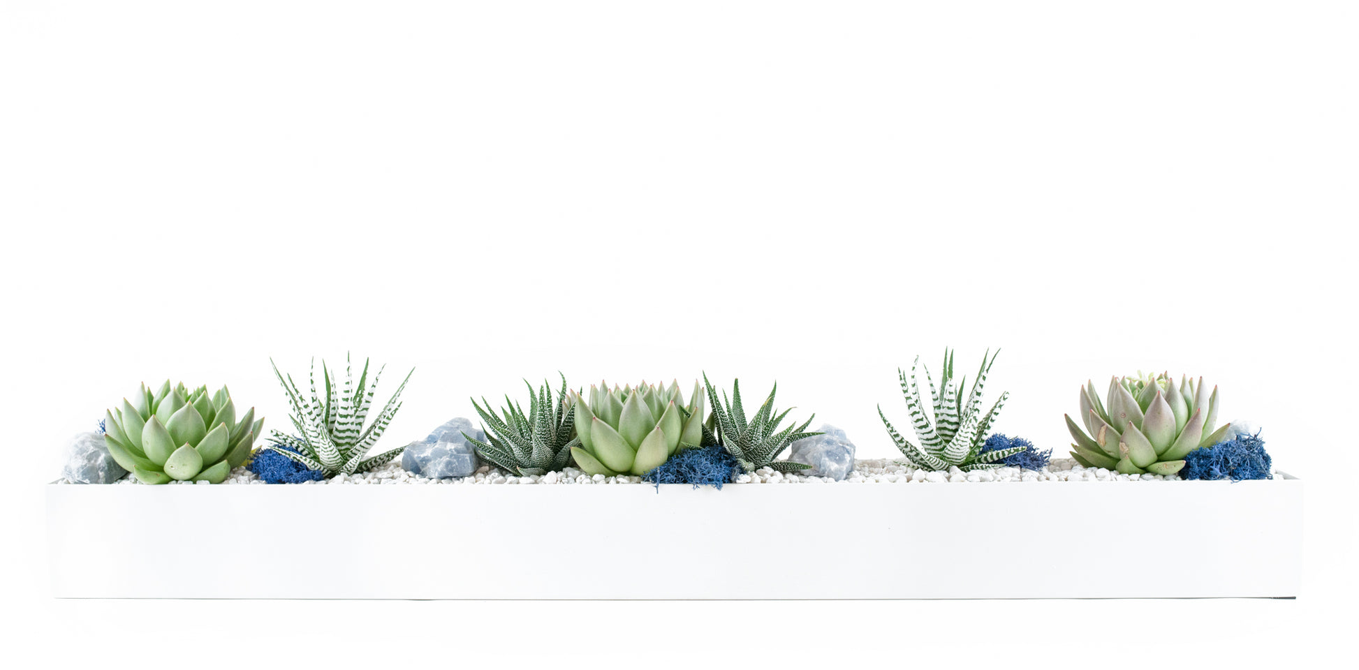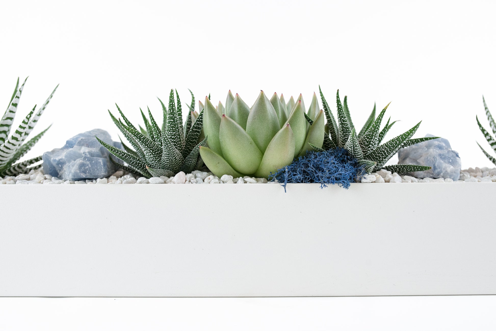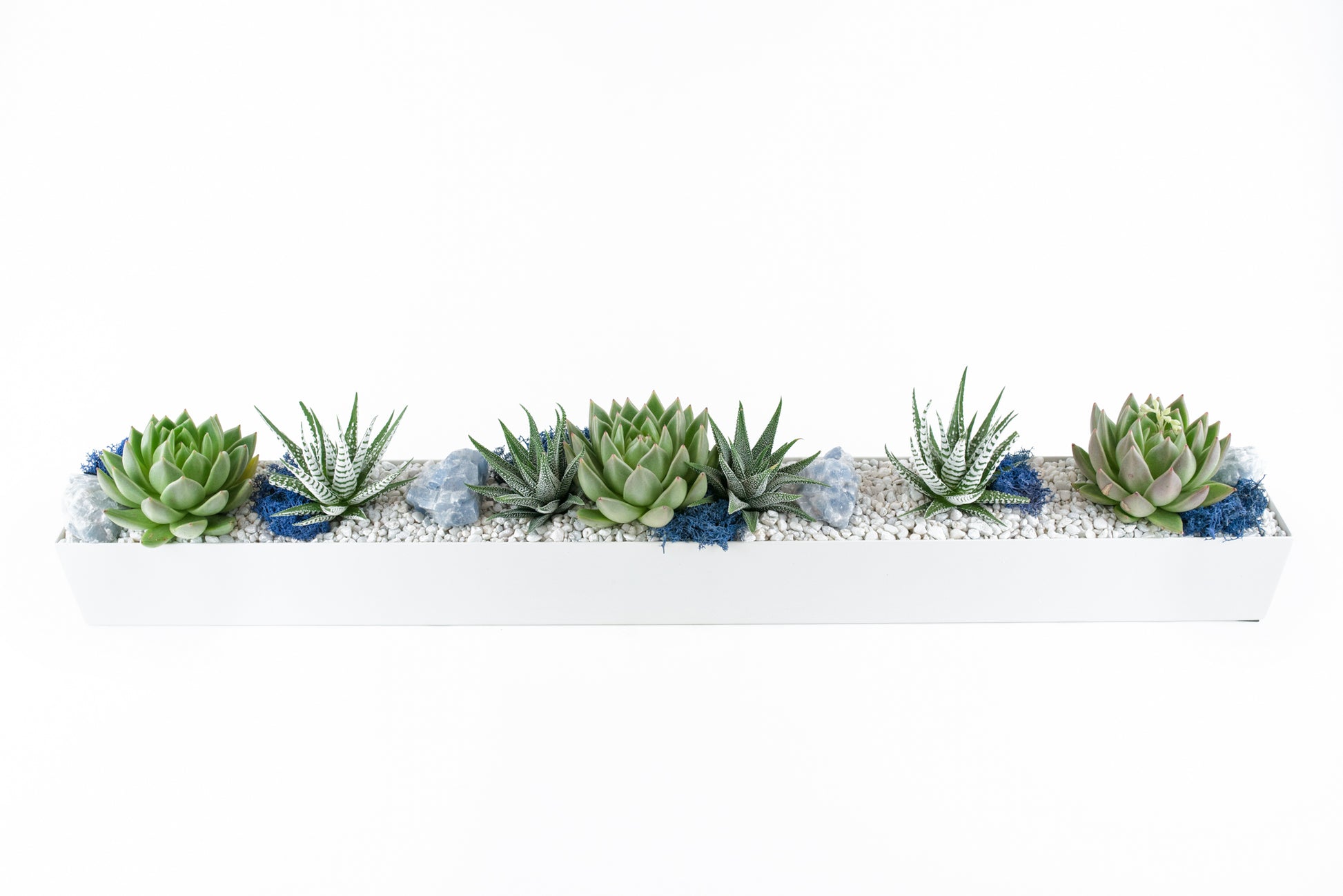 Clean and classic white rectangular vessel spotted with cut succulents and accents of blue reindeer moss and blue calcite.