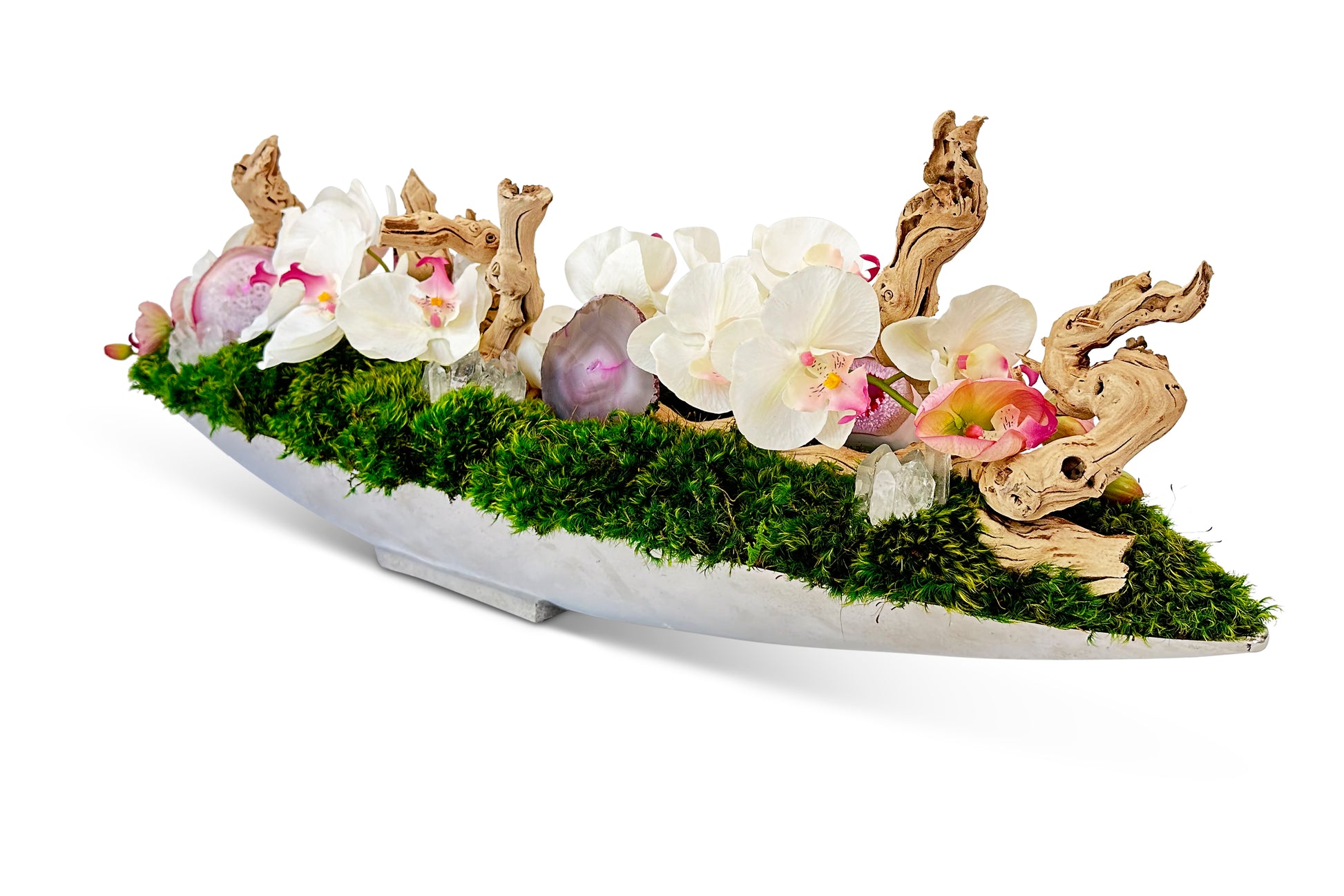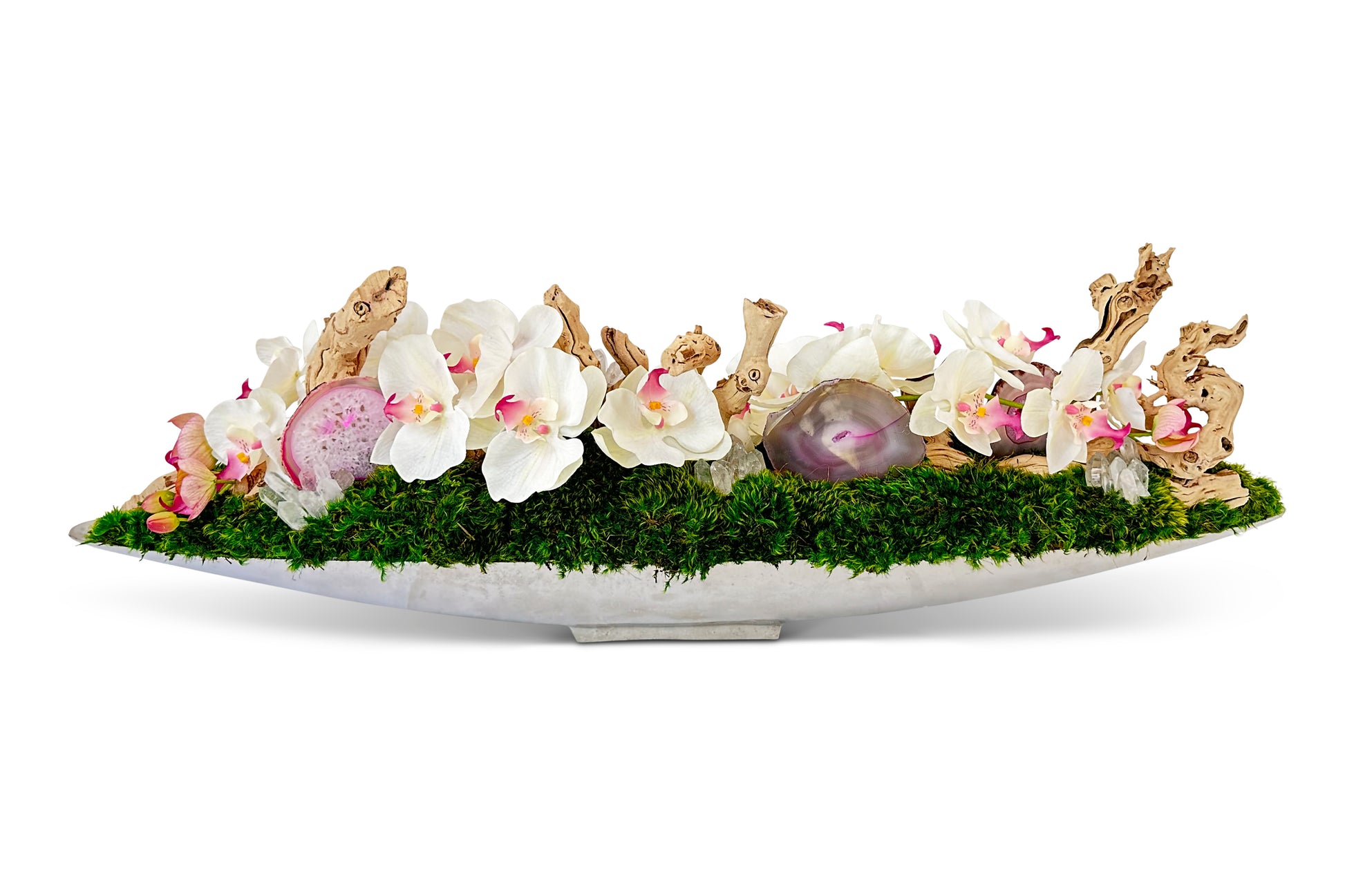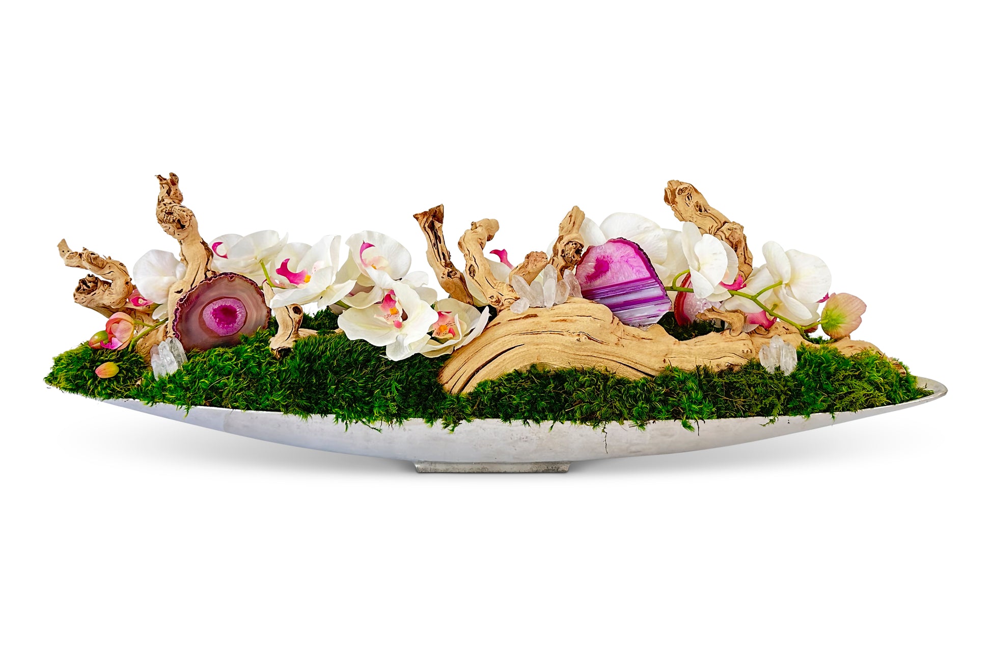 Silver metal vase with preserved green mood moss, accented with natural grape wood, draped faux blush orchids, pink agate slices, and healing clear quartz point gemstones