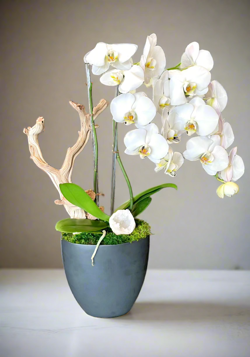 This stunning Real Orchid design features live waterfall white orchids with beautifully fluffy mood moss, an organic ghostwood branch and light-catching sparkly Moroccan geode half to create a truly showstopping modern arrangement.